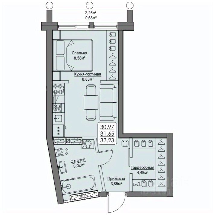 Продаётся 1-комнатная квартира в строящемся доме (Дом 1), срок сдачи: II-кв. 2027, общей площадью 36.97 кв.м., на 21 этаже.