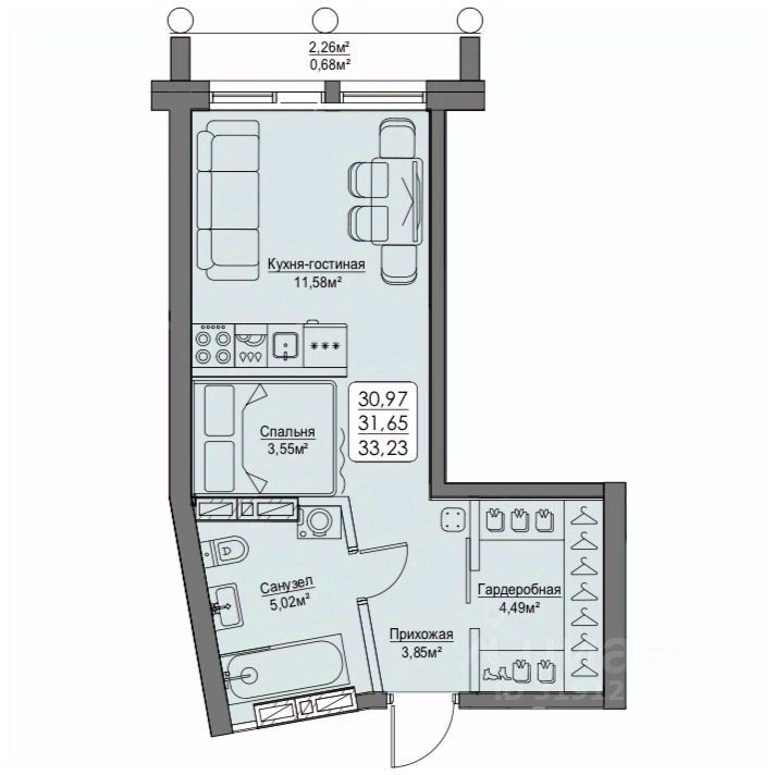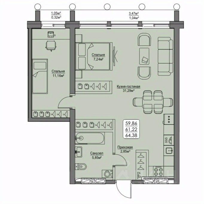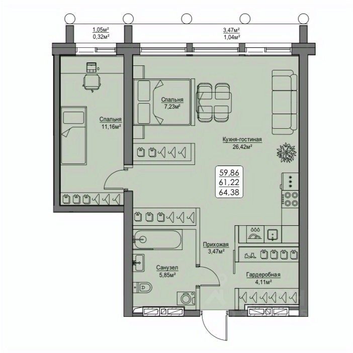Продаётся 2-комнатная квартира в строящемся доме (Дом 1), срок сдачи: II-кв. 2027, общей площадью 57.26 кв.м., на 11 этаже.