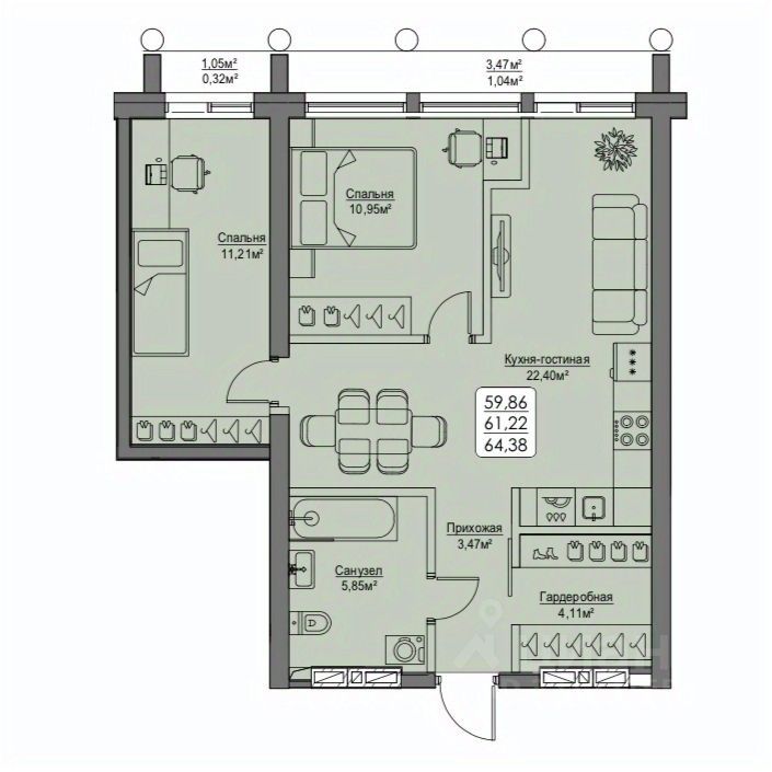 Продаётся 3-комнатная квартира в строящемся доме (Дом 1), срок сдачи: II-кв. 2027, общей площадью 55.76 кв.м., на 1 этаже.