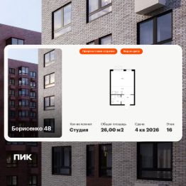 Продаётся квартира-студия площадью 26 кв.м на 16 этаже 28 этажного дома (Корпус 2, Секция 2) проекта ПИК Борисенко 48. Светлый просторный подъезд на уровне земли, функциональная планировка, большие окна, предчистовая отделка. ''Борисенко 48'' - небольшой квартал в Первомайском районе, в 15 минутах пути на автомобиле от центра Владивостока. С верхних этажей откроется живописный вид на город и сопки. В проекте всего четыре дома и подземный паркинг, в который можно будет спуститься на лифте. Высота домов от 17 до 30 этажей - благодаря переменной этажности солнце будет лучше освещать двор и квартиры. На первых этажах откроются пекарни, кафе, магазины и другие сервисы - это удобно, когда внезапно закончится хлеб или захочется побаловать себя горячим кофе. Из каждого дома будет выход в уютный двор-парк - это закрытая территория для отдыха, где растут цветы и деревья, оборудованы детские и спортивные площадки. Рядом с ''Борисенко 48'' появится также детский сад для 150 малышей. В пешей доступности есть всё необходимое для комфортной жизни: школы, детские сады, поликлиника и магазины. До крупных торговых центров ''Калина Молл'' и ''Луговая'', а также супермаркета ''Реми'' - всего 5 минут на машине. А до озера на Сафонова, которое отлично подходит для прогулок и отдыха, можно дойти пешком за 9 минут. Живописная Леопардовая набережная - в 10 минутах на автомобиле. Из квартала можно будет выехать как на улицу Борисенко, так и на улицу Сафонова. Артикул 919420 (Застройщик ООО ''СЗ ''Юстина'')