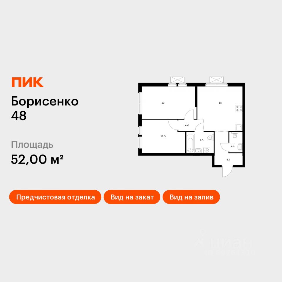 Продаётся 2-комн. квартира площадью 52 кв.м на 22 этаже 28 этажного дома (Корпус 2, Секция 2) проекта ПИК Борисенко 48. Светлый просторный подъезд на уровне земли, функциональная планировка, большие окна, предчистовая отделка. ''Борисенко 48'' - небольшой квартал в Первомайском районе, в 15 минутах пути на автомобиле от центра Владивостока. С верхних этажей откроется живописный вид на город и сопки. В проекте всего четыре дома и подземный паркинг, в который можно будет спуститься на лифте. Высота домов от 17 до 30 этажей - благодаря переменной этажности солнце будет лучше освещать двор и квартиры. На первых этажах откроются пекарни, кафе, магазины и другие сервисы - это удобно, когда внезапно закончится хлеб или захочется побаловать себя горячим кофе. Из каждого дома будет выход в уютный двор-парк - это закрытая территория для отдыха, где растут цветы и деревья, оборудованы детские и спортивные площадки. Рядом с ''Борисенко 48'' появится также детский сад для 150 малышей. В пешей доступности есть всё необходимое для комфортной жизни: школы, детские сады, поликлиника и магазины. До крупных торговых центров ''Калина Молл'' и ''Луговая'', а также супермаркета ''Реми'' - всего 5 минут на машине. А до озера на Сафонова, которое отлично подходит для прогулок и отдыха, можно дойти пешком за 9 минут. Живописная Леопардовая набережная - в 10 минутах на автомобиле. Из квартала можно будет выехать как на улицу Борисенко, так и на улицу Сафонова. Артикул 923336 (Застройщик ООО ''СЗ ''Юстина'')