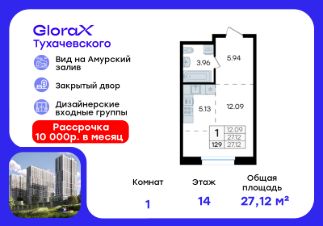 Продается квартира-студия на 13-м этаже в квартале GloraX Клубный. GloraX Клубный - уникальный видовой проект с выделяющейся архитектурой в развитом районе Владивостока. Общая площадь лота составляет 31,12 кв. м, из которых 13,46 кв. м отведено под жилую и 9,00 кв. м под кухонную зону. Номер квартиры - 372.Преимущества квартиры:студия, высокий этаж.Преимущества проекта:• Квартиры с панорамными видами на бухту Патрокл, маяк Басаргина и остров Русский• Планировочные решения под любой жизненный сценарий от 23 до 67 м²• Гардеробные комнаты, увеличенные панорамные окна, просторные кухни-гостиные• Эксклюзивное благоустройство: продуманное зонирование, игровые и спортивные площадки, площадка для стритбола, амфитеатр• Премиальный дизайн входных групп с лаунж-зоной• Безбарьерная среда, закрытая территория, видеонаблюдение• Лапомойки, колясочные и туалеты на первом этаже• Двухуровневый подземный паркинг на 350 машино-мест с лифтом на жилые этажи• Келлеры на цокольном этаже для хранения сезонных вещей с доступом на лифте• Современный ландшафтный дизайн комплекса от DEREVOPARKGloraX Клубный заповедник в черте мегаполиса. Комплекс тщательно продуман для максимального удобства и обеспечения безопасности его жителей. Квартал расположен в одном из самых современных развивающихся районов города: совсем рядом раскинулась живописная бухта Патрокл, где можно прогуляться по облагороженной пешеходной набережной, заглянуть на пляж или в школу серфинга. Комплекс имеет прекрасную транспортную доступность: рядом проходит объездная трасса СеданкаПатрокл, а до центар можно доехать всего за 15 минут.Проект включает 3 монолитных корпуса, каждый из которых спроектирован с акцентом на комфорт, безопасность и современный образ жизни рядом с уникальной природой. Общий двор создает приватную территорию для житей комплекса.В комплексе предусмотрен двухуровневый подземный паркинг на 350 машино-мест с доступом прямо с жилых этажей. Паркинг оборудован современными системами видеонаблюдения, контроля въезда-выезда и пожаротушения. На цокольном этаже размещаются келлеры для хранения сезонных и габаритных вещей. Доступ к кладовым на лифте с жилых этажей. Современный ландшафтный дизайн жилого комплекса GloraX Клубный создан ведущей российской студией DEREVOPARK. Во дворе для детей всех возрастов предусмотрены различные игровые площадки с лазалками, батутами, качелями и песочницей. В центре расположен специальный ''зеленый остров'', где взрослые могут отдохнуть на качелях и гамаках в тени больших деревьев. Для любителей спорта предусмотрены две специальные спортивные площадки для настольного тенниса и стритбола — для зрителей тоже найдется место! А еще на территории комплекса будет дорожка для роллеров и любителей покататься на велосипеде, самокате или скейте.В шаговой доступности располагаются все необходимые объекты социальной и коммерческой инфраструктуры.Цена указана при 100% оплате или станд