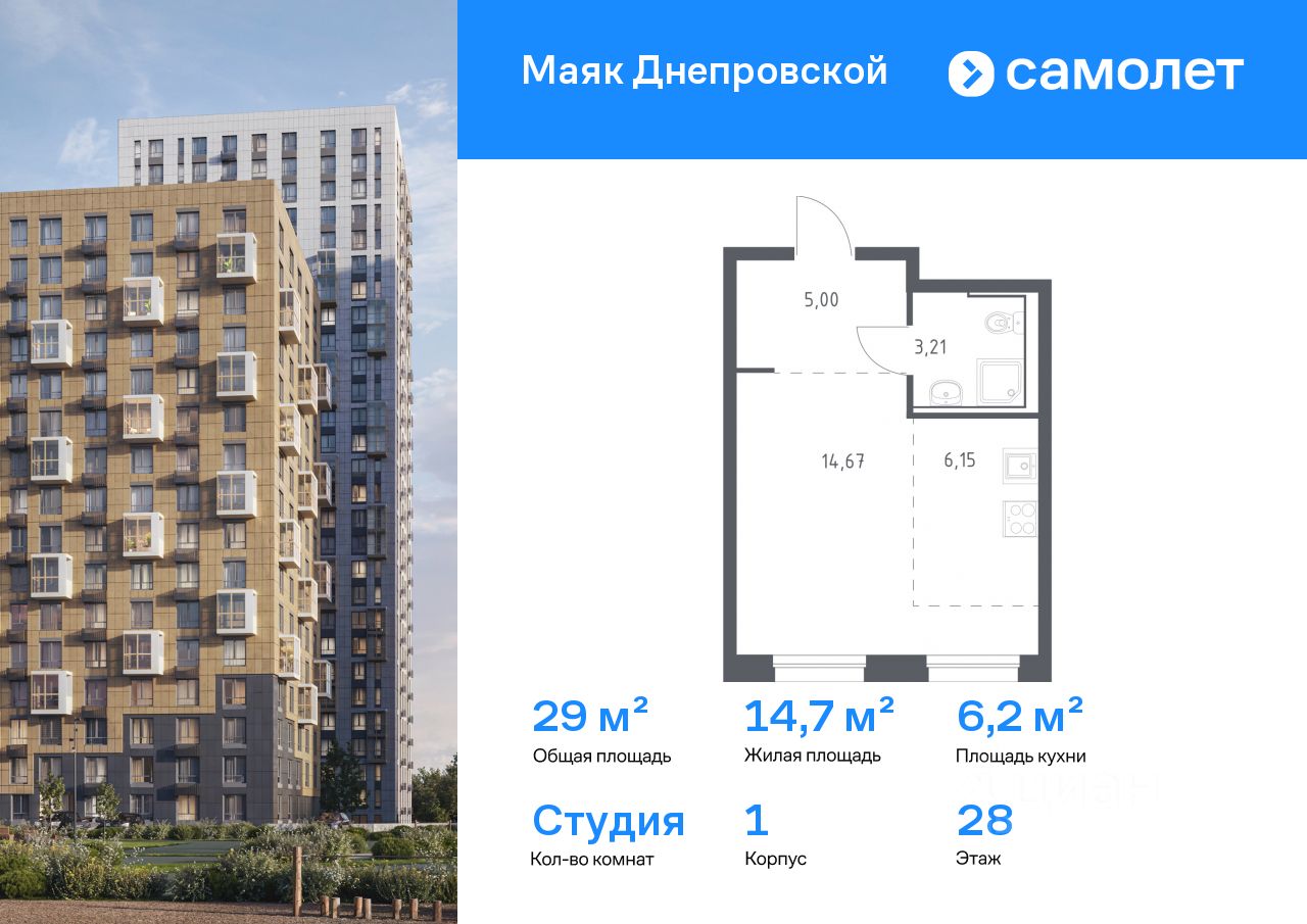 Предлагается квартира студия комфорт-класса 29,03 кв.м в корпусе 1 на 28 этаже, в ЖК ''Маяк Днепровской'' Квартира без отделки. Доступность опции ''отделка'' и возможность комплектации мебелью и декором уточняйте у застройщика. Приобрести квартиру возможно по специальным акциям от застройщика, с текущими условиями акций можно ознакомиться в блоке ''Акций''. Цена динамическая и может отличаться, уточняйте актуальность у застройщика. ''Маяк Днепровской'' — это маленький город с домами высотой от 17 до 30 этажей. Мы строим современные здания со стилобатами и террасами, которые отвечают архитектурным трендам, но при этом гармонично вписываются в окружающие пейзажи. Переменная этажность домов повторяет уникальный дальневосточный ландшафт, а оттенки фасадов перекликаются с красками природы. Здесь вы будете любоваться живописными закатами и встречать рассветы с панорамного балкона.