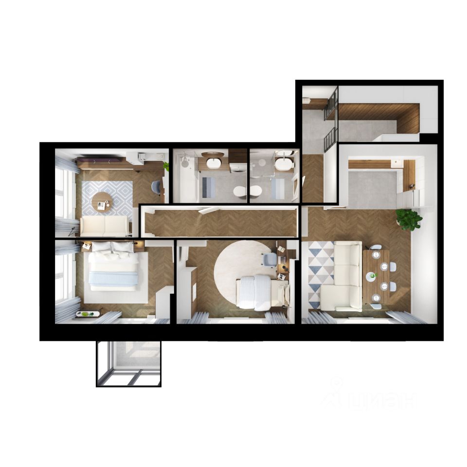 Комфорт, продуманный до мелочей Грамотное зонирование кухни-гостиной создаёт ощущение двух отдельных пространств — для кулинарных экспериментов и отдыха Уютная мастер-спальня с личным санузлом, выделенным местом под шкаф и лоджией обеспечивает комфортное личное пространство для отдыха Функциональная детская идеально подходит для организации спального и рабочего места, а благодаря месту под систему хранения поддержание порядка не составит труда Отдельный санузел с ванной и местом под стиральную машину делает жизнь семьи максимально удобной, а утренние сборы оптимизированными Просторная прихожая обеспечивает комфортную навигацию между всеми зонами квартиры