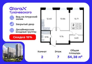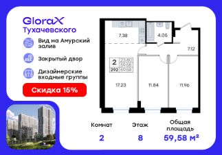 Продается квартира-студия на 8-м этаже в жилом комплексе GloraX Тухачевского — современном проекте нового формата в престижном районе Владивостока. Общая площадь лота составляет 38,09 кв. м, из которых 19,42 кв. м отведено под жилую и 7,14 кв. м под кухонную зону. Номер квартиры - 63.Преимущества квартиры:студия, гардеробная.Преимущества проекта:• Панорамный вид на Амурский залив и зелёные сопки• Удачное расположение и транспортная доступность: Первореченский район, 20 минут до центра города• Закрытая охраняемая территория с доступом только для жителей• Эксклюзивное благоустройство: продуманное зонирование, игровые и спортивные площадки, арт-инсталляция, Тайный сад• Безбарьерная среда, видеонаблюдений, Wi-Fi на территории• Премиальный дизайн входных групп реcепшн и лаунж-зоной• Лапомойки, колясочные и туалеты на первом этаже• Подземный паркинг на 449 машиномест с доступом на лифте с жилых этажей• Индивидуальные кладовые на цокольном этаже от 2 до 10 м2GloraX Тухачевского — это городское пространство нового формата, которое позволяет современным горожанам находить все необходимые атрибуты комфортной жизни внутри своего жилого комплекса. Весь комплекс спроектирован так, чтобы жить здесь было удобно и безопасно: светлые лаунж-зоны и ресепшн на входах в жилые корпуса, эксклюзивный дизайн мест общего пользования и придомовой территории, круглосуточная охрана, видеонаблюдение и даже детский сад в одном из корпусов все, что необходимо современному городскому жителю. GloraX Тухачевского находится в одном из самых престижных районов города с хорошей, давно сформировавшейся инфраструктурой и отличной транспортной доступностью. Отсюда легко добраться до центра города, других районов и даже пригорода как на собственном транспорте, так и на общественном. Квартал имеет прямой выезд на ул. Тухачевского, а рядом с комплексом расположена автобусная остановка на несколько маршрутов.Проект состоит из 3 монолитных корпусов, объединенных единым стилобатом. В комплексе предусмотрены: подземный паркинг с лифтом на жилые этажи, кладовые для хранения, благоустроенный двор без машин, детские и спортивные площадки, зоны для отдыха и прогулок.Эксклюзивный проект благоустройства территории разработан одной из лучших студий ландшафтного дизайна DEREVOPARK с фокусом на комфорт и удобство для всех жителей комплекса.Вся необходимая инфраструктура — магазины, школы, детские сады, остановки общественного транспорта — находится рядом.Узнайте подробности и подберите свою квартиру в GloraX Тухачевского — в отделе продаж уже сегодня.Цена указана при 100% оплате или стандартной ипотеке. Узнайте подробности в Отделе продаж.