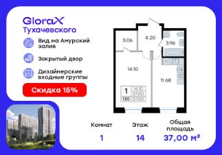 Продается 1-комн. квартира на 14-м этаже в жилом комплексе GloraX Тухачевского — современном проекте нового формата в престижном районе Владивостока. Общая площадь лота составляет 37,00 кв. м, из которых 14,10 кв. м отведено под жилую и 11,68 кв. м под кухонную зону. Номер квартиры - 130.Преимущества квартиры:однокомнатная квартира, высокий этаж, гардеробная.Преимущества проекта:• Панорамный вид на Амурский залив и зелёные сопки• Удачное расположение и транспортная доступность: Первореченский район, 20 минут до центра города• Закрытая охраняемая территория с доступом только для жителей• Эксклюзивное благоустройство: продуманное зонирование, игровые и спортивные площадки, арт-инсталляция, Тайный сад• Безбарьерная среда, видеонаблюдений, Wi-Fi на территории• Премиальный дизайн входных групп реcепшн и лаунж-зоной• Лапомойки, колясочные и туалеты на первом этаже• Подземный паркинг на 449 машиномест с доступом на лифте с жилых этажей• Индивидуальные кладовые на цокольном этаже от 2 до 10 м2GloraX Тухачевского — это городское пространство нового формата, которое позволяет современным горожанам находить все необходимые атрибуты комфортной жизни внутри своего жилого комплекса. Весь комплекс спроектирован так, чтобы жить здесь было удобно и безопасно: светлые лаунж-зоны и ресепшн на входах в жилые корпуса, эксклюзивный дизайн мест общего пользования и придомовой территории, круглосуточная охрана, видеонаблюдение и даже детский сад в одном из корпусов все, что необходимо современному городскому жителю. GloraX Тухачевского находится в одном из самых престижных районов города с хорошей, давно сформировавшейся инфраструктурой и отличной транспортной доступностью. Отсюда легко добраться до центра города, других районов и даже пригорода как на собственном транспорте, так и на общественном. Квартал имеет прямой выезд на ул. Тухачевского, а рядом с комплексом расположена автобусная остановка на несколько маршрутов.Проект состоит из 3 монолитных корпусов, объединенных единым стилобатом. В комплексе предусмотрены: подземный паркинг с лифтом на жилые этажи, кладовые для хранения, благоустроенный двор без машин, детские и спортивные площадки, зоны для отдыха и прогулок.Эксклюзивный проект благоустройства территории разработан одной из лучших студий ландшафтного дизайна DEREVOPARK с фокусом на комфорт и удобство для всех жителей комплекса.Вся необходимая инфраструктура — магазины, школы, детские сады, остановки общественного транспорта — находится рядом.Узнайте подробности и подберите свою квартиру в GloraX Тухачевского — в отделе продаж уже сегодня.Цена указана при 100% оплате или стандартной ипотеке. Узнайте подробности в Отделе продаж.