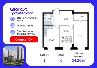 Продается 2-комн. квартира на 6-м этаже в жилом комплексе GloraX Тухачевского — современном проекте нового формата в престижном районе Владивостока. Общая площадь лота составляет 54,26 кв. м, из которых 24,51 кв. м отведено под жилую и 12,60 кв. м под кухонную зону. Номер квартиры - 51.Преимущества квартиры:двухкомнатная квартира, гардеробная.Преимущества проекта:• Панорамный вид на Амурский залив и зелёные сопки• Удачное расположение и транспортная доступность: Первореченский район, 20 минут до центра города• Закрытая охраняемая территория с доступом только для жителей• Эксклюзивное благоустройство: продуманное зонирование, игровые и спортивные площадки, арт-инсталляция, Тайный сад• Безбарьерная среда, видеонаблюдений, Wi-Fi на территории• Премиальный дизайн входных групп реcепшн и лаунж-зоной• Лапомойки, колясочные и туалеты на первом этаже• Подземный паркинг на 449 машиномест с доступом на лифте с жилых этажей• Индивидуальные кладовые на цокольном этаже от 2 до 10 м2GloraX Тухачевского — это городское пространство нового формата, которое позволяет современным горожанам находить все необходимые атрибуты комфортной жизни внутри своего жилого комплекса. Весь комплекс спроектирован так, чтобы жить здесь было удобно и безопасно: светлые лаунж-зоны и ресепшн на входах в жилые корпуса, эксклюзивный дизайн мест общего пользования и придомовой территории, круглосуточная охрана, видеонаблюдение и даже детский сад в одном из корпусов все, что необходимо современному городскому жителю. GloraX Тухачевского находится в одном из самых престижных районов города с хорошей, давно сформировавшейся инфраструктурой и отличной транспортной доступностью. Отсюда легко добраться до центра города, других районов и даже пригорода как на собственном транспорте, так и на общественном. Квартал имеет прямой выезд на ул. Тухачевского, а рядом с комплексом расположена автобусная остановка на несколько маршрутов.Проект состоит из 3 монолитных корпусов, объединенных единым стилобатом. В комплексе предусмотрены: подземный паркинг с лифтом на жилые этажи, кладовые для хранения, благоустроенный двор без машин, детские и спортивные площадки, зоны для отдыха и прогулок.Эксклюзивный проект благоустройства территории разработан одной из лучших студий ландшафтного дизайна DEREVOPARK с фокусом на комфорт и удобство для всех жителей комплекса.Вся необходимая инфраструктура — магазины, школы, детские сады, остановки общественного транспорта — находится рядом.Узнайте подробности и подберите свою квартиру в GloraX Тухачевского — в отделе продаж уже сегодня.Цена указана при 100% оплате или стандартной ипотеке. Узнайте подробности в Отделе продаж.