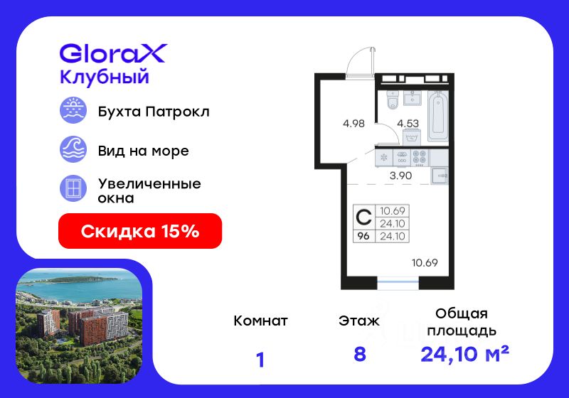 Продается квартира-студия на 8-м этаже в квартале GloraX Клубный. GloraX Клубный - уникальный видовой проект с выделяющейся архитектурой в развитом районе Владивостока. Общая площадь лота составляет 24,10 кв. м, из которых 10,69 кв. м отведено под жилую и 3,90 кв. м под кухонную зону. Номер квартиры - 96. Преимущества квартиры: студия, вид на море. Преимущества проекта: • Квартиры с панорамными видами на бухту Патрокл, маяк Басаргина и остров Русский • Планировочные решения под любой жизненный сценарий от 23 до 67 м² • Гардеробные комнаты, увеличенные панорамные окна, просторные кухни-гостиные • Эксклюзивное благоустройство: продуманное зонирование, игровые и спортивные площадки, площадка для стритбола, амфитеатр • Премиальный дизайн входных групп с лаунж-зоной • Безбарьерная среда, закрытая территория, видеонаблюдение • Лапомойки, колясочные и туалеты на первом этаже • Двухуровневый подземный паркинг на 350 машино-мест с лифтом на жилые этажи • Келлеры на цокольном этаже для хранения сезонных вещей с доступом на лифте • Современный ландшафтный дизайн комплекса от DEREVOPARK GloraX Клубный заповедник в черте мегаполиса. Комплекс тщательно продуман для максимального удобства и обеспечения безопасности его жителей. Квартал расположен в одном из самых современных развивающихся районов города: совсем рядом раскинулась живописная бухта Патрокл, где можно прогуляться по облагороженной пешеходной набережной, заглянуть на пляж или в школу серфинга. Комплекс имеет прекрасную транспортную доступность: рядом проходит объездная трасса СеданкаПатрокл, а до центар можно доехать всего за 15 минут. Проект включает 3 монолитных корпуса, каждый из которых спроектирован с акцентом на комфорт, безопасность и современный образ жизни рядом с уникальной природой. Общий двор создает приватную территорию для житей комплекса. В комплексе предусмотрен двухуровневый подземный паркинг на 350 машино-мест с доступом прямо с жилых этажей. Паркинг оборудован современными системами видеонаблюдения, контроля въезда-выезда и пожаротушения. На цокольном этаже размещаются келлеры для хранения сезонных и габаритных вещей. Доступ к кладовым на лифте с жилых этажей. Современный ландшафтный дизайн жилого комплекса GloraX Клубный создан ведущей российской студией DEREVOPARK. Во дворе для детей всех возрастов предусмотрены различные игровые площадки с лазалками, батутами, качелями и песочницей. В центре расположен специальный ''зеленый остров'', где взрослые могут отдохнуть на качелях и гамаках в тени больших деревьев. Для любителей спорта предусмотрены две специальные спортивные площадки для настольного тенниса и стритбола — для зрителей тоже найдется место! А еще на территории комплекса будет дорожка для роллеров и любителей покататься на велосипеде, самокате или скейте. В шаговой доступности располагаются все необходимые объекты социальной и коммерческой инфраструктуры. Цена указана при 100% оплате или стандарт