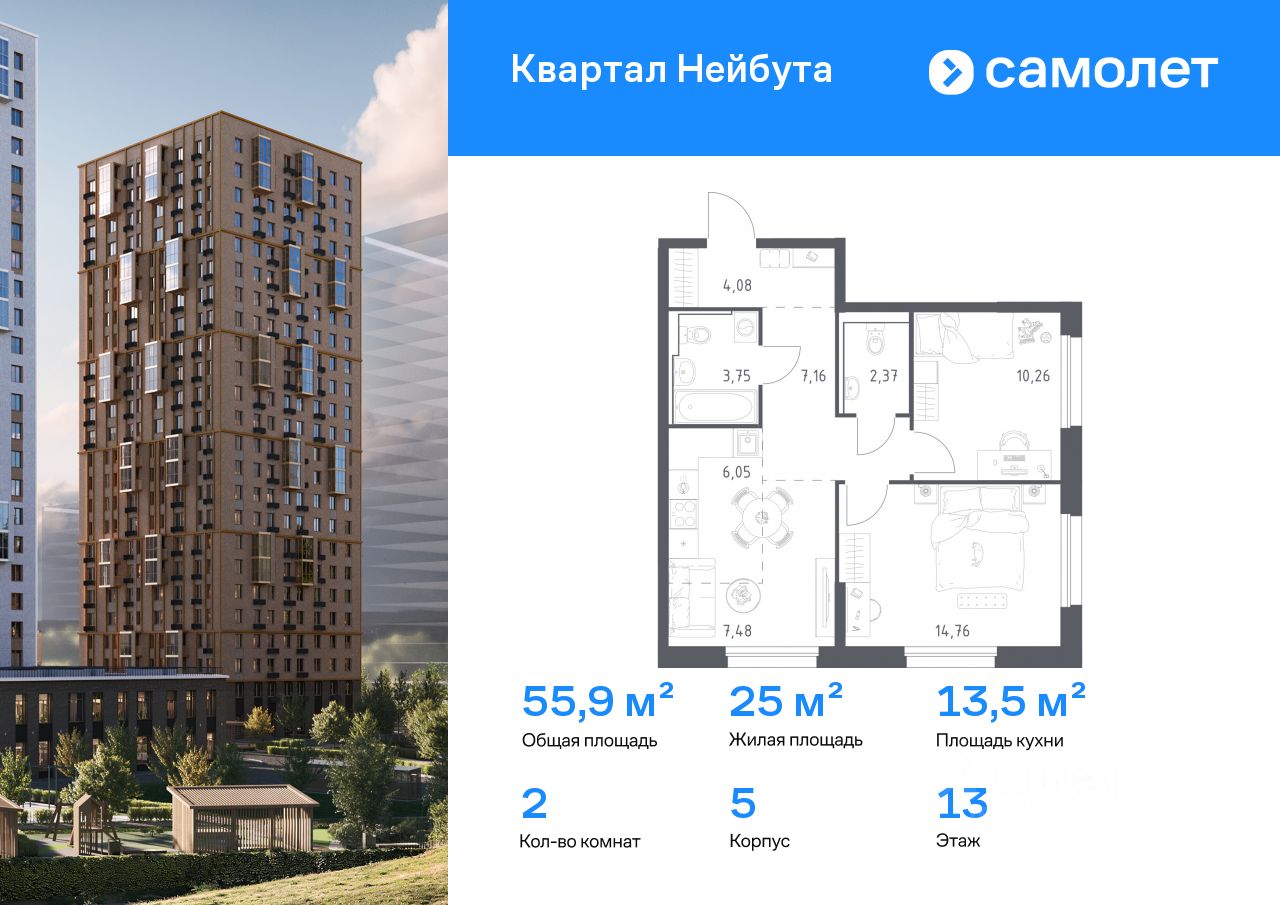 Строим кварталы для жизни с заботой о будущем. Предлагается 2-комнатная квартира комфорт-класса 55,91 кв.м в корпусе 5 на 13 этаже, в ЖК ''Квартал Нейбута'' Квартира с чистовой отделкой. Доступность дополнительных опций уточняйте у застройщика. Приобрести квартиру возможно по специальным акциям от застройщика, с текущими условиями акций можно ознакомиться в блоке ''Акций''. Цена динамическая и может отличаться, уточняйте актуальность у застройщика. ''Квартал Нейбута'' находится в Ленинском районе Владивостока. Дорога до центра города, морского и ж/д вокзалов займет 30 минут на машине или 45 минут на автобусе. Международный аэропорт находится в часе езды от дома. Скоро в квартале будет удобный выезд, откуда можно попасть на трассу Патрокл — Седанка — Де-Фриз — Новый. 26-этажные дома с отделкой золотистых и благородных коричневых оттенков гармонично впишутся в живописный дальневосточный пейзаж. Объем фасадам придают витражные балконы. Закрытые дворы без машин — маленький мир, вдохновленный природой Приморского края. Во дворе найдется занятие для всех жителей квартала. Взрослые смогут устраивать тренировки в спортивных зонах, дети будут веселиться на игровых площадках. А для четвероногих питомцев мы предусмотрели специальные зоны для выгула. Мы отказались от ступенек и порогов у входов в подъезд. Оставить коляску или велосипед можно на первом этаже, в специальном помещении. На подземном этаже предусмотрены кладовые.