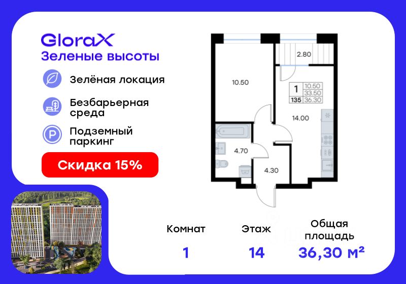 Продается 1-комн. квартира на 14-м этаже в жилом квартале GloraX Зелёные высоты — проекте в тихой зелёной локации. Общая площадь квартиры 36,30 кв. м, из которых 10,50 кв. м включая 10,50 кв. м жилого пространства и 14,00 кв. м кухни. Номер квартиры - 135. Преимущества квартиры: компактная евро-2, лоджия. Преимущества проекта: • Идеальное сочетание городской и загородной жизни • Сдаем в 2025 году • Уютный зелёный район с развитой инфраструктурой • Великолепные виды на Вечнозеленый сквер и лесопарк на 150 Га • Видеонаблюдение, IP-домофон, Wi-Fi на территории, • Дизайнерские входные группы • Безбарьерная среда, колясочные, туалеты на 1 этаже, лапомойки • Эксклюзивное благоустройство территории • Подземный паркинг на 235 машино-мест с лифтом на жилые этажи • Индивидуальные кладовые от 3 до 7 кв. м • Черновая отделка для реализации любых дизайнерских идей GloraX Зелёные высоты — современный жилой проект, сочетающий преимущества городской и пригородной жизни. Комплекс тщательно продуман для максимального удобства и обеспечения безопасности жителей. Квартал расположен в зеленом, живописном и активно развивающемся районе Зеленый Угол, вдали от серой массовой застройки. Жители GloraX Зелёные высоты смогут насладждаться прогулками в Вечнозелёном сквере или лесопарке. В непосредственной близости находятся остановки общественного транспорта и автомобильный подъезд со стороны Нейбута. Скоро также появится выездом на трассу Де-Фриз-Седанка, что обеспечит быстрый доступ в любую часть города и пригород. Проект включает 2 корпуса, каждый из которых спроектирован с акцентом на комфорт, безопасность и современный образ жизни. В комплексе предусмотрен подземный паркинг на 235 машиномест с доступом прямо с жилых этажей. Паркинг оборудован современными системами видеонаблюдения, контроля въезда-выезда и пожаротушения. Цокольный этаж здания отведен под индивидуальные кладовые площадью от 3 до 7 квадратных метров, которые можно использовать для хранения сезонных вещей. Доступ к кладовым - на лифте с жилых этажей. Территория жилого квартала благоустроена и включает игровые зоны и спортивные площадки для детей различных возрастных групп, уютные зоны отдыха со скамейками и универсальную воркаут-площадку для активного досуга. В шаговой доступности располагаются все необходимые объекты социальной инфраструктуры. Узнайте больше в отделе продаж — выберите свою квартиру в GloraX Зелёные высоты уже сегодня!
