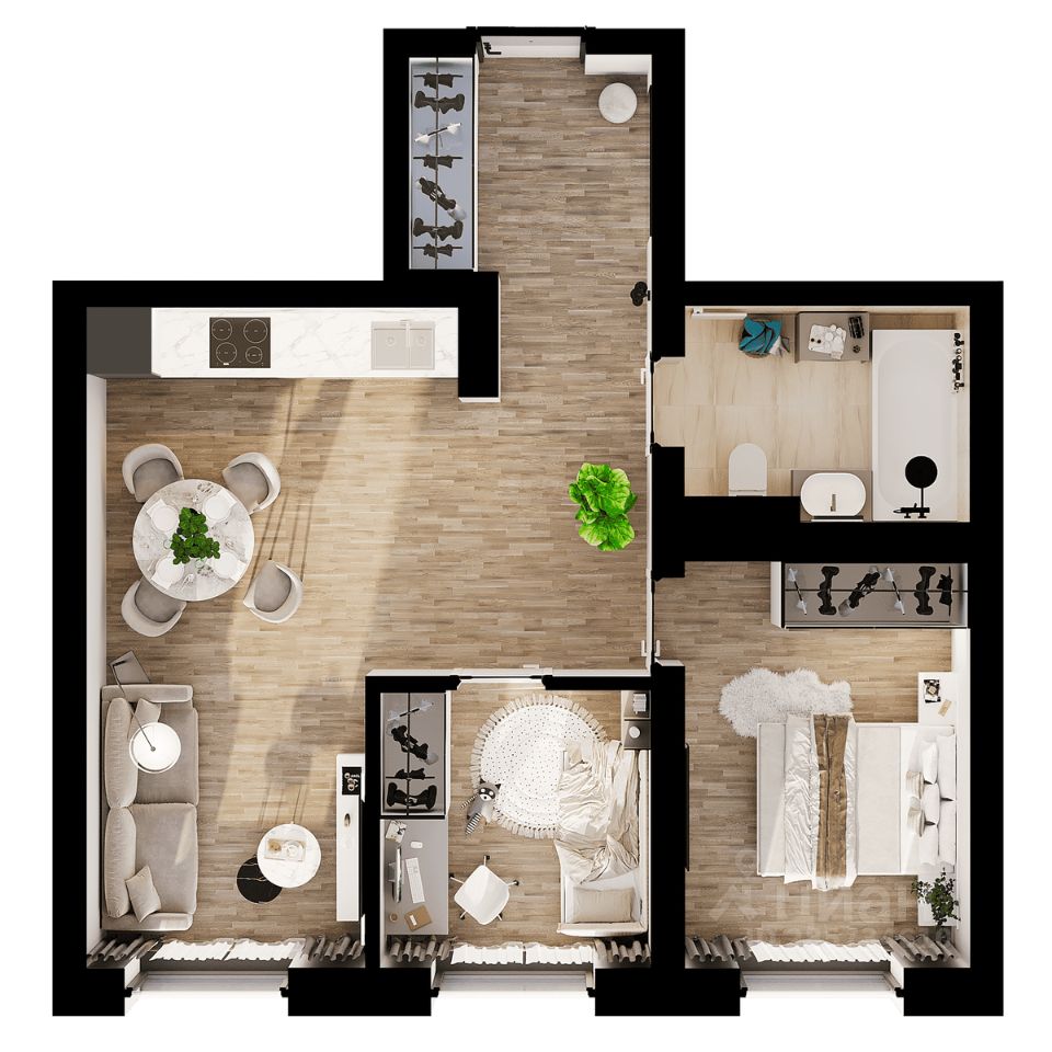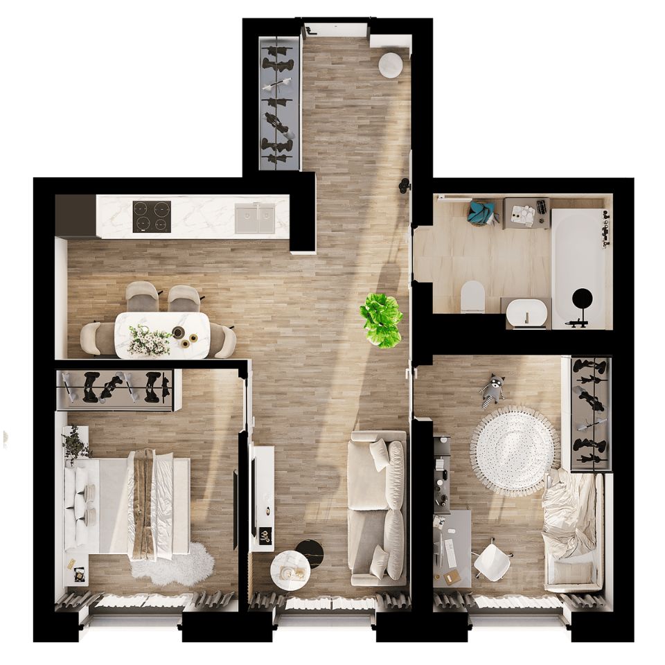 Для большой семьи, которая ценит комфорт и уют Прихожая 4,9 кв.м с местом для гардеробной Просторная кухня-столовая 21,5 кв.м идеально подходит для приготовления пищи, уютных семейных завтраков и совместных просмотров фильмов Родительская спальня с выходом на лоджию создаст романтическую атмосферу для вечерних посиделок Детская комната 9,7 кв.м для сына, чтобы вдохновлять и позволять ему развиваться, играть и расти Детская 10,8 кв.м для дочери - место для игр и творчества Две ванные комнаты обеспечивают удобство и экономию времени всей семьи