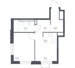 Коридор 9,1 кв.м. с пространствами для хранения с двух сторон, чтобы всем и всему хватило местаКухня-гостиная 17,7 кв.м. для времяпрепровождения всей семьиБалкон 4,2 кв.м. с видом на рассвет для душевных разговоровДетская 10,5 кв.м. хватит и для отдыха, и для продуктивной учёбы Спальня 10,9 кв.м. для вечернего расслабления и уединения от суетыВ санузел 4,7 кв.м. поместится и просторная ванна, и стиральная машина