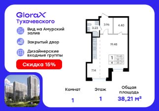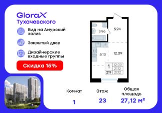 Продается квартира-студия на 21-м этаже в жилом комплексе GloraX Тухачевского — современном проекте нового формата в престижном районе Владивостока. Общая площадь лота составляет 27,12 кв. м, из которых 12,09 кв. м отведено под жилую и 5,13 кв. м под кухонную зону. Номер квартиры - 199.Преимущества квартиры:студия, высокий этаж.Преимущества проекта:• Панорамный вид на Амурский залив и зелёные сопки• Удачное расположение и транспортная доступность: Первореченский район, 20 минут до центра города• Закрытая охраняемая территория с доступом только для жителей• Эксклюзивное благоустройство: продуманное зонирование, игровые и спортивные площадки, арт-инсталляция, Тайный сад• Безбарьерная среда, видеонаблюдений, Wi-Fi на территории• Премиальный дизайн входных групп реcепшн и лаунж-зоной• Лапомойки, колясочные и туалеты на первом этаже• Подземный паркинг на 449 машиномест с доступом на лифте с жилых этажей• Индивидуальные кладовые на цокольном этаже от 2 до 10 м2GloraX Тухачевского — это городское пространство нового формата, которое позволяет современным горожанам находить все необходимые атрибуты комфортной жизни внутри своего жилого комплекса. Весь комплекс спроектирован так, чтобы жить здесь было удобно и безопасно: светлые лаунж-зоны и ресепшн на входах в жилые корпуса, эксклюзивный дизайн мест общего пользования и придомовой территории, круглосуточная охрана, видеонаблюдение и даже детский сад в одном из корпусов все, что необходимо современному городскому жителю. GloraX Тухачевского находится в одном из самых престижных районов города с хорошей, давно сформировавшейся инфраструктурой и отличной транспортной доступностью. Отсюда легко добраться до центра города, других районов и даже пригорода как на собственном транспорте, так и на общественном. Квартал имеет прямой выезд на ул. Тухачевского, а рядом с комплексом расположена автобусная остановка на несколько маршрутов.Проект состоит из 3 монолитных корпусов, объединенных единым стилобатом. В комплексе предусмотрены: подземный паркинг с лифтом на жилые этажи, кладовые для хранения, благоустроенный двор без машин, детские и спортивные площадки, зоны для отдыха и прогулок.Эксклюзивный проект благоустройства территории разработан одной из лучших студий ландшафтного дизайна DEREVOPARK с фокусом на комфорт и удобство для всех жителей комплекса.Вся необходимая инфраструктура — магазины, школы, детские сады, остановки общественного транспорта — находится рядом.Узнайте подробности и подберите свою квартиру в GloraX Тухачевского — в отделе продаж уже сегодня.Цена указана при 100% оплате или стандартной ипотеке. Узнайте подробности в Отделе продаж.