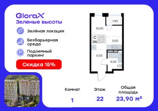 Продается квартира-студия на 22-м этаже в жилом квартале GloraX Зелёные высоты — проекте в тихой зелёной локации. Общая площадь квартиры 23,90 кв. м, из которых 10,00 кв. м включая 10,00 кв. м жилого пространства и 3,00 кв. м кухни. Номер квартиры - 286.Преимущества квартиры:зонируемая студия, лоджия.Преимущества проекта:• Идеальное сочетание городской и загородной жизни• Сдаем в 2025 году• Уютный зелёный район с развитой инфраструктурой• Великолепные виды на Вечнозеленый сквер и лесопарк на 150 Га• Видеонаблюдение, IP-домофон, Wi-Fi на территории,• Дизайнерские входные группы• Безбарьерная среда, колясочные, туалеты на 1 этаже, лапомойки• Эксклюзивное благоустройство территории • Подземный паркинг на 235 машино-мест с лифтом на жилые этажи• Индивидуальные кладовые от 3 до 7 кв. м• Черновая отделка для реализации любых дизайнерских идейGloraX Зелёные высоты — современный жилой проект, сочетающий преимущества городской и пригородной жизни. Комплекс тщательно продуман для максимального удобства и обеспечения безопасности жителей. Квартал расположен в зеленом, живописном и активно развивающемся районе Зеленый Угол, вдали от серой массовой застройки. Жители GloraX Зелёные высоты смогут насладждаться прогулками в Вечнозелёном сквере или лесопарке. В непосредственной близости находятся остановки общественного транспорта и автомобильный подъезд со стороны Нейбута. Скоро также появится выездом на трассу Де-Фриз-Седанка, что обеспечит быстрый доступ в любую часть города и пригород.Проект включает 2 корпуса, каждый из которых спроектирован с акцентом на комфорт, безопасность и современный образ жизни.В комплексе предусмотрен подземный паркинг на 235 машиномест с доступом прямо с жилых этажей. Паркинг оборудован современными системами видеонаблюдения, контроля въезда-выезда и пожаротушения. Цокольный этаж здания отведен под индивидуальные кладовые площадью от 3 до 7 квадратных метров, которые можно использовать для хранения сезонных вещей. Доступ к кладовым - на лифте с жилых этажей.Территория жилого квартала благоустроена и включает игровые зоны и спортивные площадки для детей различных возрастных групп, уютные зоны отдыха со скамейками и универсальную воркаут-площадку для активного досуга.В шаговой доступности располагаются все необходимые объекты социальной инфраструктуры.Узнайте больше в отделе продаж — выберите свою квартиру в GloraX Зелёные высоты уже сегодня!