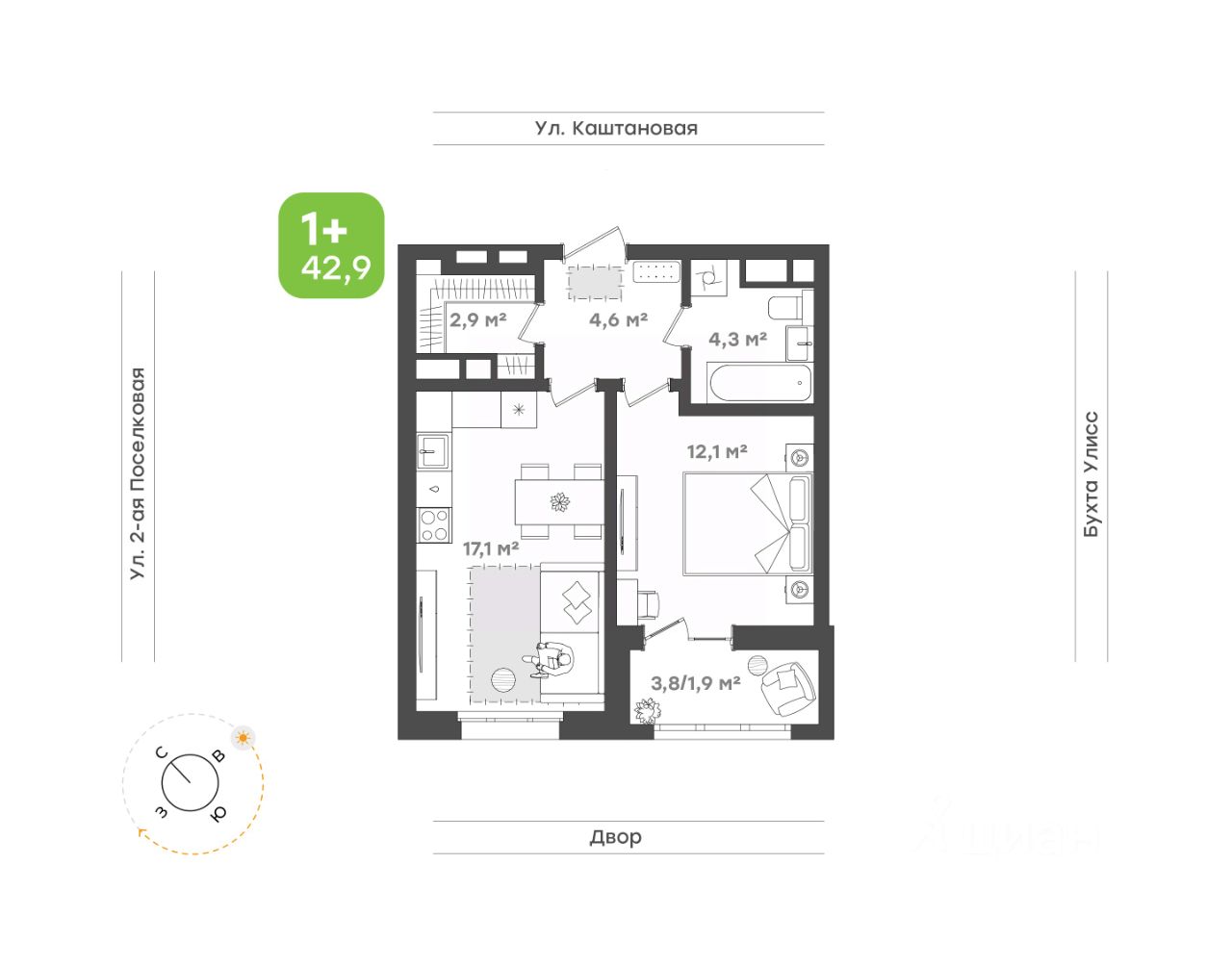 Комфортное пространство для жизни и отдыха Кухня-столовая 17,1 кв.м это идеальное место для приготовления вкусной еды и уютных посиделок за столом в кругу семьи и друзей Просторная прихожая 4,6 кв.м с гардеробной 3 кв.м, где удобно организовать хранение вещей Спальня 12,1 кв.м с выходом на лоджию - это уютный уголок, где можно наслаждаться утренним кофе с прекрасным видом Ванная 4,3 кв.м с местом под стиральную машину