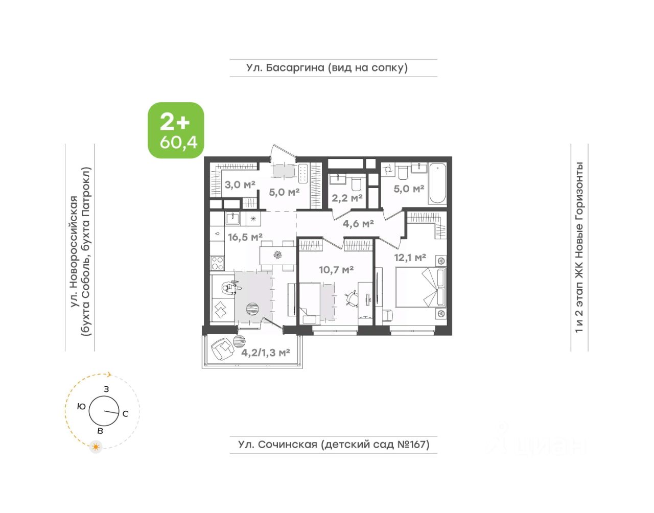 Просторная прихожая 4,6 кв.м с местом для гардероба и зоной для обуви, которая создает порядок и комфорт в квартире Кухня-гостиная 16,4 кв.м с выходом на лоджию создает комфортное пространство для приготовления еды и приятного времяпровождения в кругу семьи Увеличенная лоджия 6,2 кв.м, где можно наслаждаться свежим воздухом и красивыми панорамами Уютная спальня 11,6 кв.м для отдыха родителей после рабочего дня Удобная детская комната 10,5 кв.м для игр и занятий Два раздельных санузла для комфорта гостей и всей семьи
