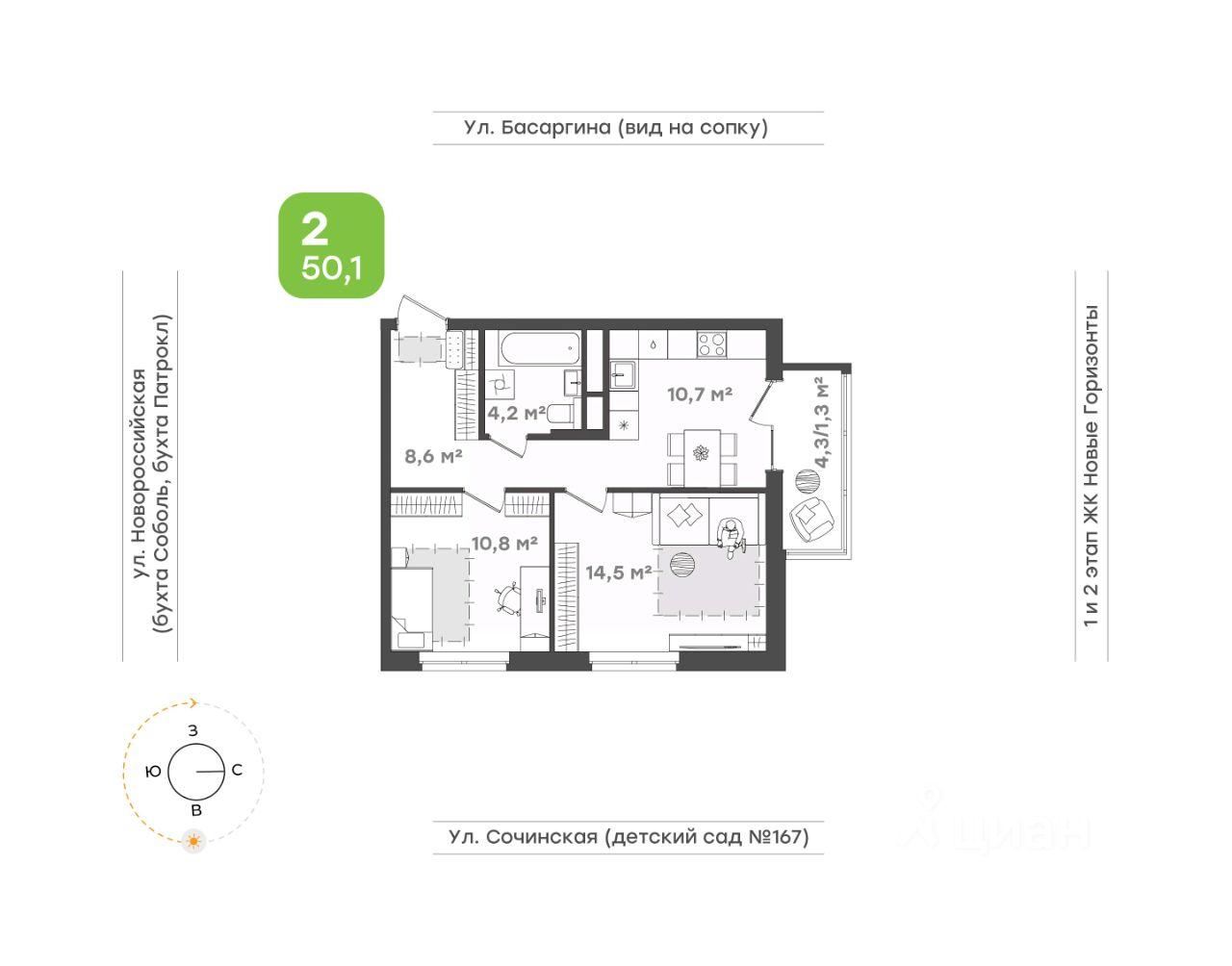 Длинный коридор 8,6 кв.м. с широким пространством под хранение, которого хватит всей семье и всем гостям Детская 10,8 кв.м. подойдёт для активных игр и комфортной учёбы Санузел 4,2 кв.м. вместит и большую ванную, и стиральную машину Кухня 10,7 кв.м. для семейных завтраков и ужинов Балкон 4,3 кв.м. с видом во двор, чтобы не беспокоиться о безопасности ребёнка, а наслаждаться архитектурой Гостиная 14,5 для киномарафонов по выходным