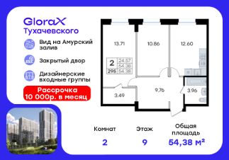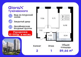 Продается 3-комн. квартира на 11-м этаже в жилом комплексе GloraX Тухачевского — современном проекте нового формата в престижном районе Владивостока. Общая площадь лота составляет 71,25 кв. м, из которых 38,49 кв. м отведено под жилую и 14,69 кв. м под кухонную зону. Номер квартиры - 101.Преимущества квартиры:трехкомнатная квартира, вид на море, угловая, 2 санузла.Преимущества проекта:• Панорамный вид на Амурский залив и зелёные сопки• Удачное расположение и транспортная доступность: Первореченский район, 20 минут до центра города• Закрытая охраняемая территория с доступом только для жителей• Эксклюзивное благоустройство: продуманное зонирование, игровые и спортивные площадки, арт-инсталляция, Тайный сад• Безбарьерная среда, видеонаблюдений, Wi-Fi на территории• Премиальный дизайн входных групп реcепшн и лаунж-зоной• Лапомойки, колясочные и туалеты на первом этаже• Подземный паркинг на 449 машиномест с доступом на лифте с жилых этажей• Индивидуальные кладовые на цокольном этаже от 2 до 10 м2GloraX Тухачевского — это городское пространство нового формата, которое позволяет современным горожанам находить все необходимые атрибуты комфортной жизни внутри своего жилого комплекса. Весь комплекс спроектирован так, чтобы жить здесь было удобно и безопасно: светлые лаунж-зоны и ресепшн на входах в жилые корпуса, эксклюзивный дизайн мест общего пользования и придомовой территории, круглосуточная охрана, видеонаблюдение и даже детский сад в одном из корпусов все, что необходимо современному городскому жителю. GloraX Тухачевского находится в одном из самых престижных районов города с хорошей, давно сформировавшейся инфраструктурой и отличной транспортной доступностью. Отсюда легко добраться до центра города, других районов и даже пригорода как на собственном транспорте, так и на общественном. Квартал имеет прямой выезд на ул. Тухачевского, а рядом с комплексом расположена автобусная остановка на несколько маршрутов.Проект состоит из 3 монолитных корпусов, объединенных единым стилобатом. В комплексе предусмотрены: подземный паркинг с лифтом на жилые этажи, кладовые для хранения, благоустроенный двор без машин, детские и спортивные площадки, зоны для отдыха и прогулок.Эксклюзивный проект благоустройства территории разработан одной из лучших студий ландшафтного дизайна DEREVOPARK с фокусом на комфорт и удобство для всех жителей комплекса.Вся необходимая инфраструктура — магазины, школы, детские сады, остановки общественного транспорта — находится рядом.Узнайте подробности и подберите свою квартиру в GloraX Тухачевского — в отделе продаж уже сегодня.Цена указана при 100% оплате или стандартной ипотеке. Узнайте подробности в Отделе продаж.