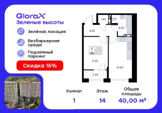 Продается 1-комн. квартира на 14-м этаже в жилом квартале GloraX Зелёные высоты — проекте в тихой зелёной локации. Общая площадь квартиры 40,00 кв. м, из которых 11,40 кв. м включая 11,40 кв. м жилого пространства и 14,00 кв. м кухни. Номер квартиры - 138.Преимущества квартиры:просторная евро-2, вид на лесопарк, лоджия, гардеробная.Преимущества проекта:• Идеальное сочетание городской и загородной жизни• Сдаем в 2025 году• Уютный зелёный район с развитой инфраструктурой• Великолепные виды на Вечнозеленый сквер и лесопарк на 150 Га• Видеонаблюдение, IP-домофон, Wi-Fi на территории,• Дизайнерские входные группы• Безбарьерная среда, колясочные, туалеты на 1 этаже, лапомойки• Эксклюзивное благоустройство территории • Подземный паркинг на 235 машино-мест с лифтом на жилые этажи• Индивидуальные кладовые от 3 до 7 кв. м• Черновая отделка для реализации любых дизайнерских идейGloraX Зелёные высоты — современный жилой проект, сочетающий преимущества городской и пригородной жизни. Комплекс тщательно продуман для максимального удобства и обеспечения безопасности жителей. Квартал расположен в зеленом, живописном и активно развивающемся районе Зеленый Угол, вдали от серой массовой застройки. Жители GloraX Зелёные высоты смогут насладждаться прогулками в Вечнозелёном сквере или лесопарке. В непосредственной близости находятся остановки общественного транспорта и автомобильный подъезд со стороны Нейбута. Скоро также появится выездом на трассу Де-Фриз-Седанка, что обеспечит быстрый доступ в любую часть города и пригород.Проект включает 2 корпуса, каждый из которых спроектирован с акцентом на комфорт, безопасность и современный образ жизни.В комплексе предусмотрен подземный паркинг на 235 машиномест с доступом прямо с жилых этажей. Паркинг оборудован современными системами видеонаблюдения, контроля въезда-выезда и пожаротушения. Цокольный этаж здания отведен под индивидуальные кладовые площадью от 3 до 7 квадратных метров, которые можно использовать для хранения сезонных вещей. Доступ к кладовым - на лифте с жилых этажей.Территория жилого квартала благоустроена и включает игровые зоны и спортивные площадки для детей различных возрастных групп, уютные зоны отдыха со скамейками и универсальную воркаут-площадку для активного досуга.В шаговой доступности располагаются все необходимые объекты социальной инфраструктуры.Узнайте больше в отделе продаж — выберите свою квартиру в GloraX Зелёные высоты уже сегодня!