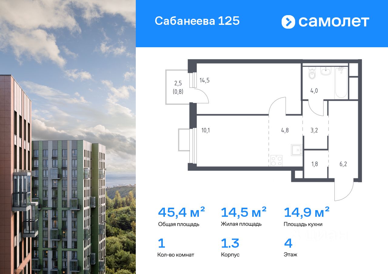 Строим кварталы для жизни с заботой о будущем. Предлагается 1-комнатная квартира комфорт-класса 45,4 кв.м в корпусе 1.3 на 4 этаже, в ЖК ''Сабанеева 125'' Квартира без отделки. Доступность опции ''отделка'' и возможность комплектации мебелью и декором уточняйте у застройщика. Приобрести квартиру возможно по специальным акциям от застройщика, с текущими условиями акций можно ознакомиться в блоке ''Акций''. Цена динамическая и может отличаться, уточняйте актуальность у застройщика. В жилом комплексе ''Сабанеева 125'' вы ежедневно будете наслаждаться видами сопок. Холмистый рельеф защищает территорию от ветра. Комплекс расположен в Первореченском районе Владивостока, всего в 20 минутах на машине до центра города. На первых этажах откроются супермаркеты, кафе и пекарни. Для малышей — детский сад в 2 минутах пешком и школа в 10 минутах. За 6 минут можно доехать до Нагорного парка, а за 15 минут — до набережной Цесаревича с панорамой Золотого моста. Комплекс состоит из 3 монолитных домов высотой 25 этажей с фасадами, дизайн которых вдохновлен птицами Дальнего Востока. Дворы оформлены как сад с дальневосточной флорой, есть смотровые площадки, скалодром, перголы и игровые зоны для детей. Подземный паркинг — трехуровневый. В сквозные подъезды без ступеней и с помещением для колясок удобно заходить. В жилом комплексе ''Сабанеева 125'' есть квартиры с индивидуальными зелеными террасами, увеличенными окнами и панорамными балконами для чаепитий с видом на сопки и залив.