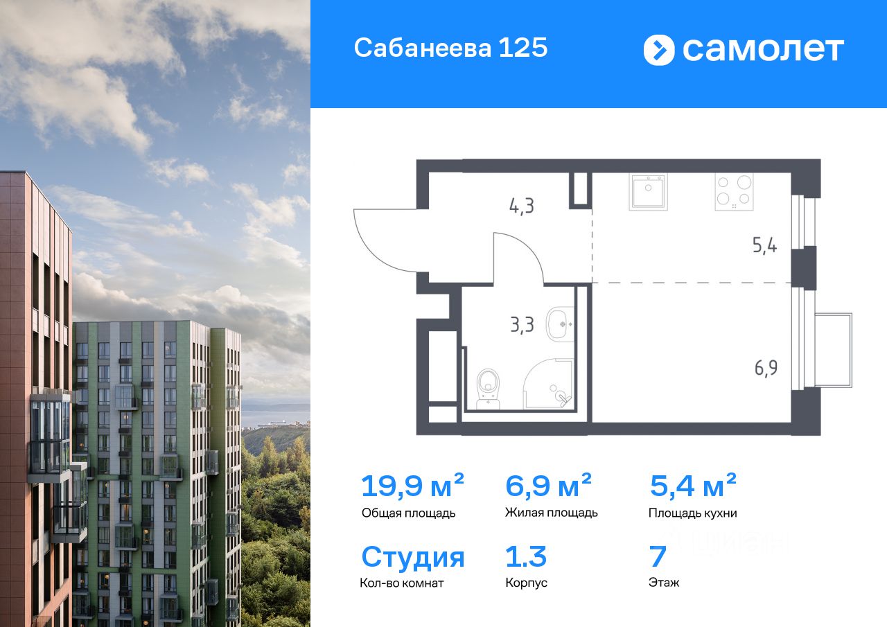 Строим кварталы для жизни с заботой о будущем. Предлагается квартира студия комфорт-класса 19,9 кв.м в корпусе 1.3 на 7 этаже, в ЖК ''Сабанеева 125'' Квартира без отделки. Доступность опции ''отделка'' и возможность комплектации мебелью и декором уточняйте у застройщика. Приобрести квартиру возможно по специальным акциям от застройщика, с текущими условиями акций можно ознакомиться в блоке ''Акций''. Цена динамическая и может отличаться, уточняйте актуальность у застройщика. В жилом комплексе ''Сабанеева 125'' вы ежедневно будете наслаждаться видами сопок. Холмистый рельеф защищает территорию от ветра. Комплекс расположен в Первореченском районе Владивостока, всего в 20 минутах на машине до центра города. На первых этажах откроются супермаркеты, кафе и пекарни. Для малышей — детский сад в 2 минутах пешком и школа в 10 минутах. За 6 минут можно доехать до Нагорного парка, а за 15 минут — до набережной Цесаревича с панорамой Золотого моста. Комплекс состоит из 3 монолитных домов высотой 25 этажей с фасадами, дизайн которых вдохновлен птицами Дальнего Востока. Дворы оформлены как сад с дальневосточной флорой, есть смотровые площадки, скалодром, перголы и игровые зоны для детей. Подземный паркинг — трехуровневый. В сквозные подъезды без ступеней и с помещением для колясок удобно заходить. В жилом комплексе ''Сабанеева 125'' есть квартиры с индивидуальными зелеными террасами, увеличенными окнами и панорамными балконами для чаепитий с видом на сопки и залив.