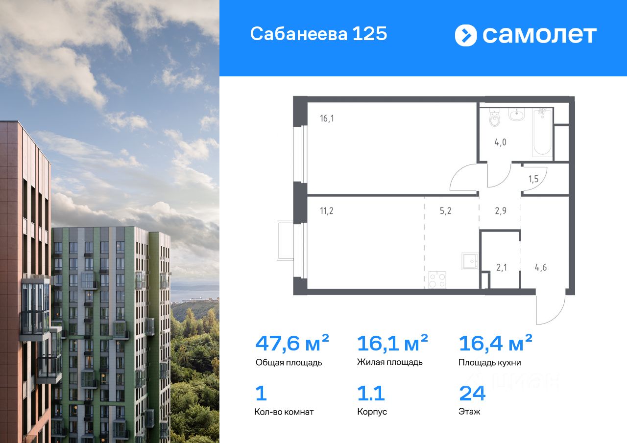 Строим кварталы для жизни с заботой о будущем. Предлагается 1-комнатная квартира комфорт-класса 47,6 кв.м в корпусе 1.1 на 24 этаже, в ЖК ''Сабанеева 125'' Квартира без отделки. Доступность опции ''отделка'' и возможность комплектации мебелью и декором уточняйте у застройщика. Приобрести квартиру возможно по специальным акциям от застройщика, с текущими условиями акций можно ознакомиться в блоке ''Акций''. Цена динамическая и может отличаться, уточняйте актуальность у застройщика. В жилом комплексе ''Сабанеева 125'' вы ежедневно будете наслаждаться видами сопок. Холмистый рельеф защищает территорию от ветра. Комплекс расположен в Первореченском районе Владивостока, всего в 20 минутах на машине до центра города. На первых этажах откроются супермаркеты, кафе и пекарни. Для малышей — детский сад в 2 минутах пешком и школа в 10 минутах. За 6 минут можно доехать до Нагорного парка, а за 15 минут — до набережной Цесаревича с панорамой Золотого моста. Комплекс состоит из 3 монолитных домов высотой 25 этажей с фасадами, дизайн которых вдохновлен птицами Дальнего Востока. Дворы оформлены как сад с дальневосточной флорой, есть смотровые площадки, скалодром, перголы и игровые зоны для детей. Подземный паркинг — трехуровневый. В сквозные подъезды без ступеней и с помещением для колясок удобно заходить. В жилом комплексе ''Сабанеева 125'' есть квартиры с индивидуальными зелеными террасами, увеличенными окнами и панорамными балконами для чаепитий с видом на сопки и залив.