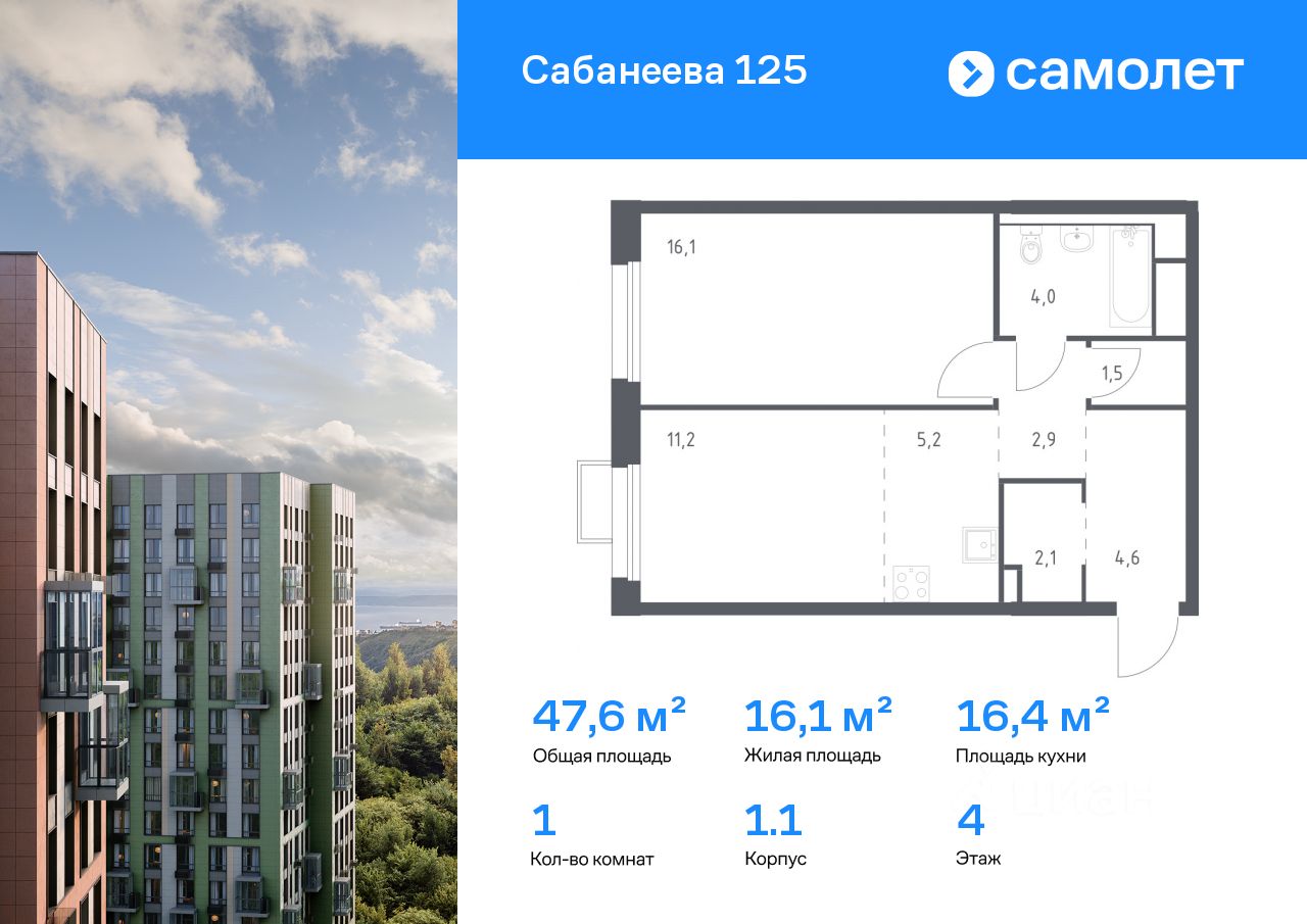 Строим кварталы для жизни с заботой о будущем. Предлагается 1-комнатная квартира комфорт-класса 47,6 кв.м в корпусе 1.1 на 4 этаже, в ЖК ''Сабанеева 125'' Квартира без отделки. Доступность опции ''отделка'' и возможность комплектации мебелью и декором уточняйте у застройщика. Приобрести квартиру возможно по специальным акциям от застройщика, с текущими условиями акций можно ознакомиться в блоке ''Акций''. Цена динамическая и может отличаться, уточняйте актуальность у застройщика. В жилом комплексе ''Сабанеева 125'' вы ежедневно будете наслаждаться видами сопок. Холмистый рельеф защищает территорию от ветра. Комплекс расположен в Первореченском районе Владивостока, всего в 20 минутах на машине до центра города. На первых этажах откроются супермаркеты, кафе и пекарни. Для малышей — детский сад в 2 минутах пешком и школа в 10 минутах. За 6 минут можно доехать до Нагорного парка, а за 15 минут — до набережной Цесаревича с панорамой Золотого моста. Комплекс состоит из 3 монолитных домов высотой 25 этажей с фасадами, дизайн которых вдохновлен птицами Дальнего Востока. Дворы оформлены как сад с дальневосточной флорой, есть смотровые площадки, скалодром, перголы и игровые зоны для детей. Подземный паркинг — трехуровневый. В сквозные подъезды без ступеней и с помещением для колясок удобно заходить. В жилом комплексе ''Сабанеева 125'' есть квартиры с индивидуальными зелеными террасами, увеличенными окнами и панорамными балконами для чаепитий с видом на сопки и залив.