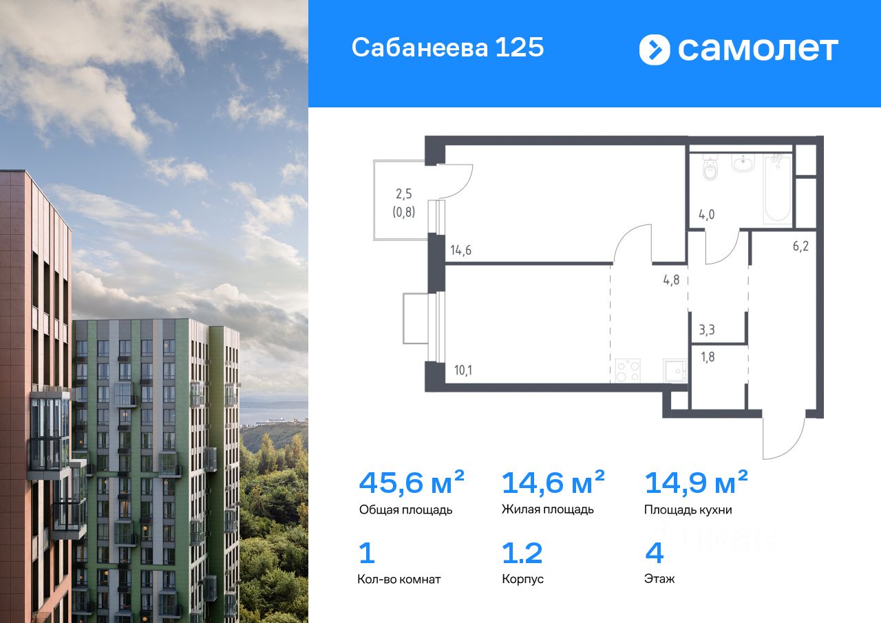 Строим кварталы для жизни с заботой о будущем. Предлагается 1-комнатная квартира комфорт-класса 45,6 кв.м в корпусе 1.2 на 4 этаже, в ЖК ''Сабанеева 125'' Квартира без отделки. Доступность опции ''отделка'' и возможность комплектации мебелью и декором уточняйте у застройщика. Приобрести квартиру возможно по специальным акциям от застройщика, с текущими условиями акций можно ознакомиться в блоке ''Акций''. Цена динамическая и может отличаться, уточняйте актуальность у застройщика. В жилом комплексе ''Сабанеева 125'' вы ежедневно будете наслаждаться видами сопок. Холмистый рельеф защищает территорию от ветра. Комплекс расположен в Первореченском районе Владивостока, всего в 20 минутах на машине до центра города. На первых этажах откроются супермаркеты, кафе и пекарни. Для малышей — детский сад в 2 минутах пешком и школа в 10 минутах. За 6 минут можно доехать до Нагорного парка, а за 15 минут — до набережной Цесаревича с панорамой Золотого моста. Комплекс состоит из 3 монолитных домов высотой 25 этажей с фасадами, дизайн которых вдохновлен птицами Дальнего Востока. Дворы оформлены как сад с дальневосточной флорой, есть смотровые площадки, скалодром, перголы и игровые зоны для детей. Подземный паркинг — трехуровневый. В сквозные подъезды без ступеней и с помещением для колясок удобно заходить. В жилом комплексе ''Сабанеева 125'' есть квартиры с индивидуальными зелеными террасами, увеличенными окнами и панорамными балконами для чаепитий с видом на сопки и залив.