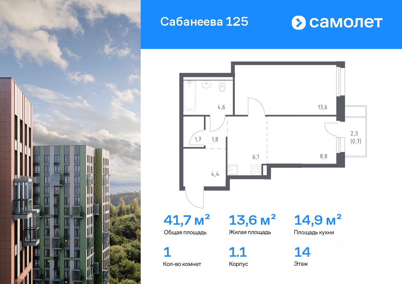 Строим кварталы для жизни с заботой о будущем. Предлагается 1-комнатная квартира комфорт-класса 41,7 кв.м в корпусе 1.1 на 14 этаже, в ЖК ''Сабанеева 125'' Квартира без отделки. Доступность опции ''отделка'' и возможность комплектации мебелью и декором уточняйте у застройщика. Приобрести квартиру возможно по специальным акциям от застройщика, с текущими условиями акций можно ознакомиться в блоке ''Акций''. Цена динамическая и может отличаться, уточняйте актуальность у застройщика. В жилом комплексе ''Сабанеева 125'' вы ежедневно будете наслаждаться видами сопок. Холмистый рельеф защищает территорию от ветра. Комплекс расположен в Первореченском районе Владивостока, всего в 20 минутах на машине до центра города. На первых этажах откроются супермаркеты, кафе и пекарни. Для малышей — детский сад в 2 минутах пешком и школа в 10 минутах. За 6 минут можно доехать до Нагорного парка, а за 15 минут — до набережной Цесаревича с панорамой Золотого моста. Комплекс состоит из 3 монолитных домов высотой 25 этажей с фасадами, дизайн которых вдохновлен птицами Дальнего Востока. Дворы оформлены как сад с дальневосточной флорой, есть смотровые площадки, скалодром, перголы и игровые зоны для детей. Подземный паркинг — трехуровневый. В сквозные подъезды без ступеней и с помещением для колясок удобно заходить. В жилом комплексе ''Сабанеева 125'' есть квартиры с индивидуальными зелеными террасами, увеличенными окнами и панорамными балконами для чаепитий с видом на сопки и залив.