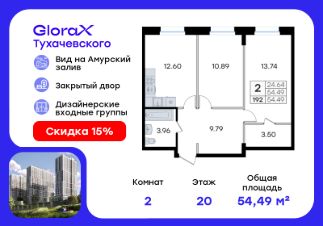 Продается 1-комн. квартира на 23-м этаже в жилом комплексе GloraX Тухачевского — современном проекте нового формата в престижном районе Владивостока. Общая площадь лота составляет 37,72 кв. м, из которых 14,10 кв. м отведено под жилую и 11,68 кв. м под кухонную зону. Номер квартиры - 216.Преимущества квартиры:однокомнатная квартира, высокий этаж, гардеробная.Преимущества проекта:• Панорамный вид на Амурский залив и зелёные сопки• Удачное расположение и транспортная доступность: Первореченский район, 20 минут до центра города• Закрытая охраняемая территория с доступом только для жителей• Эксклюзивное благоустройство: продуманное зонирование, игровые и спортивные площадки, арт-инсталляция, Тайный сад• Безбарьерная среда, видеонаблюдений, Wi-Fi на территории• Премиальный дизайн входных групп реcепшн и лаунж-зоной• Лапомойки, колясочные и туалеты на первом этаже• Подземный паркинг на 449 машиномест с доступом на лифте с жилых этажей• Индивидуальные кладовые на цокольном этаже от 2 до 10 м2GloraX Тухачевского — это городское пространство нового формата, которое позволяет современным горожанам находить все необходимые атрибуты комфортной жизни внутри своего жилого комплекса. Весь комплекс спроектирован так, чтобы жить здесь было удобно и безопасно: светлые лаунж-зоны и ресепшн на входах в жилые корпуса, эксклюзивный дизайн мест общего пользования и придомовой территории, круглосуточная охрана, видеонаблюдение и даже детский сад в одном из корпусов все, что необходимо современному городскому жителю. GloraX Тухачевского находится в одном из самых престижных районов города с хорошей, давно сформировавшейся инфраструктурой и отличной транспортной доступностью. Отсюда легко добраться до центра города, других районов и даже пригорода как на собственном транспорте, так и на общественном. Квартал имеет прямой выезд на ул. Тухачевского, а рядом с комплексом расположена автобусная остановка на несколько маршрутов.Проект состоит из 3 монолитных корпусов, объединенных единым стилобатом. В комплексе предусмотрены: подземный паркинг с лифтом на жилые этажи, кладовые для хранения, благоустроенный двор без машин, детские и спортивные площадки, зоны для отдыха и прогулок.Эксклюзивный проект благоустройства территории разработан одной из лучших студий ландшафтного дизайна DEREVOPARK с фокусом на комфорт и удобство для всех жителей комплекса.Вся необходимая инфраструктура — магазины, школы, детские сады, остановки общественного транспорта — находится рядом.Узнайте подробности и подберите свою квартиру в GloraX Тухачевского — в отделе продаж уже сегодня.Цена указана при 100% оплате или стандартной ипотеке. Узнайте подробности в Отделе продаж.