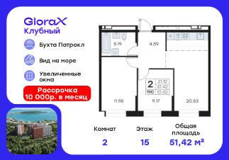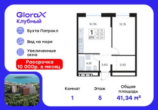 Продается 1-комн. квартира на 5-м этаже в квартале GloraX Клубный. GloraX Клубный - уникальный видовой проект с выделяющейся архитектурой в развитом районе Владивостока. Общая площадь лота составляет 41,34 кв. м, из которых 12,15 кв. м отведено под жилую и 16,96 кв. м под кухонную зону. Номер квартиры - 270.Преимущества квартиры:евро-двухкомнатная квартира, гардеробная.Преимущества проекта:• Квартиры с панорамными видами на бухту Патрокл, маяк Басаргина и остров Русский• Планировочные решения под любой жизненный сценарий от 23 до 67 м²• Гардеробные комнаты, увеличенные панорамные окна, просторные кухни-гостиные• Эксклюзивное благоустройство: продуманное зонирование, игровые и спортивные площадки, площадка для стритбола, амфитеатр• Премиальный дизайн входных групп с лаунж-зоной• Безбарьерная среда, закрытая территория, видеонаблюдение• Лапомойки, колясочные и туалеты на первом этаже• Двухуровневый подземный паркинг на 350 машино-мест с лифтом на жилые этажи• Келлеры на цокольном этаже для хранения сезонных вещей с доступом на лифте• Современный ландшафтный дизайн комплекса от DEREVOPARKGloraX Клубный заповедник в черте мегаполиса. Комплекс тщательно продуман для максимального удобства и обеспечения безопасности его жителей. Квартал расположен в одном из самых современных развивающихся районов города: совсем рядом раскинулась живописная бухта Патрокл, где можно прогуляться по облагороженной пешеходной набережной, заглянуть на пляж или в школу серфинга. Комплекс имеет прекрасную транспортную доступность: рядом проходит объездная трасса СеданкаПатрокл, а до центар можно доехать всего за 15 минут.Проект включает 3 монолитных корпуса, каждый из которых спроектирован с акцентом на комфорт, безопасность и современный образ жизни рядом с уникальной природой. Общий двор создает приватную территорию для житей комплекса.В комплексе предусмотрен двухуровневый подземный паркинг на 350 машино-мест с доступом прямо с жилых этажей. Паркинг оборудован современными системами видеонаблюдения, контроля въезда-выезда и пожаротушения. На цокольном этаже размещаются келлеры для хранения сезонных и габаритных вещей. Доступ к кладовым на лифте с жилых этажей. Современный ландшафтный дизайн жилого комплекса GloraX Клубный создан ведущей российской студией DEREVOPARK. Во дворе для детей всех возрастов предусмотрены различные игровые площадки с лазалками, батутами, качелями и песочницей. В центре расположен специальный ''зеленый остров'', где взрослые могут отдохнуть на качелях и гамаках в тени больших деревьев. Для любителей спорта предусмотрены две специальные спортивные площадки для настольного тенниса и стритбола — для зрителей тоже найдется место! А еще на территории комплекса будет дорожка для роллеров и любителей покататься на велосипеде, самокате или скейте.В шаговой доступности располагаются все необходимые объекты социальной и коммерческой инфраструктуры.Цена указана при