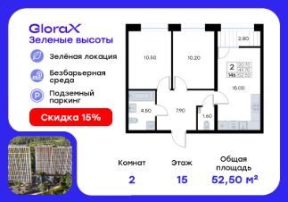 Продается 2-комн. квартира на 15-м этаже в жилом квартале GloraX Зелёные высоты — проекте в тихой зелёной локации. Общая площадь квартиры 52,50 кв. м, из которых 20,70 кв. м включая 20,70 кв. м жилого пространства и 15,00 кв. м кухни. Номер квартиры - 146.Преимущества квартиры:компактная евро-3, лоджия.Преимущества проекта:• Идеальное сочетание городской и загородной жизни• Сдаем в 2025 году• Уютный зелёный район с развитой инфраструктурой• Великолепные виды на Вечнозеленый сквер и лесопарк на 150 Га• Видеонаблюдение, IP-домофон, Wi-Fi на территории,• Дизайнерские входные группы• Безбарьерная среда, колясочные, туалеты на 1 этаже, лапомойки• Эксклюзивное благоустройство территории • Подземный паркинг на 235 машино-мест с лифтом на жилые этажи• Индивидуальные кладовые от 3 до 7 кв. м• Черновая отделка для реализации любых дизайнерских идейGloraX Зелёные высоты — современный жилой проект, сочетающий преимущества городской и пригородной жизни. Комплекс тщательно продуман для максимального удобства и обеспечения безопасности жителей. Квартал расположен в зеленом, живописном и активно развивающемся районе Зеленый Угол, вдали от серой массовой застройки. Жители GloraX Зелёные высоты смогут насладждаться прогулками в Вечнозелёном сквере или лесопарке. В непосредственной близости находятся остановки общественного транспорта и автомобильный подъезд со стороны Нейбута. Скоро также появится выездом на трассу Де-Фриз-Седанка, что обеспечит быстрый доступ в любую часть города и пригород.Проект включает 2 корпуса, каждый из которых спроектирован с акцентом на комфорт, безопасность и современный образ жизни.В комплексе предусмотрен подземный паркинг на 235 машиномест с доступом прямо с жилых этажей. Паркинг оборудован современными системами видеонаблюдения, контроля въезда-выезда и пожаротушения. Цокольный этаж здания отведен под индивидуальные кладовые площадью от 3 до 7 квадратных метров, которые можно использовать для хранения сезонных вещей. Доступ к кладовым - на лифте с жилых этажей.Территория жилого квартала благоустроена и включает игровые зоны и спортивные площадки для детей различных возрастных групп, уютные зоны отдыха со скамейками и универсальную воркаут-площадку для активного досуга.В шаговой доступности располагаются все необходимые объекты социальной инфраструктуры.Узнайте больше в отделе продаж — выберите свою квартиру в GloraX Зелёные высоты уже сегодня!
