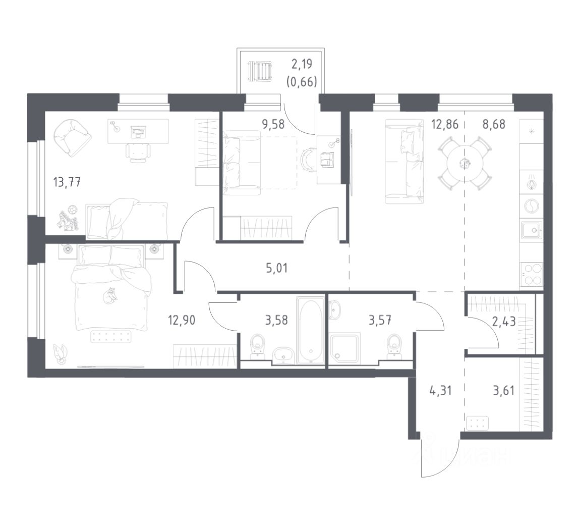Строим кварталы для жизни с заботой о будущем. Предлагается 3-комнатная квартира комфорт-класса площадью 80.96 кв.м в корпусе 5КВ на 24-м этаже, в жилом комплексе ''Квартал Нейбута''. Выбирайте свое место для счастливой жизни: от уютной студии до просторной 3-комнатной квартиры. Хотите погрузиться в творческий процесс ремонта? Присмотритесь к вариантам предчистовой отделки. Если хотите сразу отпраздновать новоселье, поручите нам работы по отделке. Мы установим двери, окна и сантехнику, положим ламинат и плитку. На стенах будут обои, которые можно перекрашивать до 8 раз. По вашему желанию мы подготовим в вашей квартире все для комфортной жизни. Откройте дверь своим ключом и пройдитесь по комнатам. Там уже будет мебель, светильники и другие элементы декора. А на кухне бежевых оттенков есть все, чтобы сразу приготовить вкусный ужин для близких. Приобрести квартиры возможно по специальным акциям от застройщика, с текущими условиями акций можно ознакомиться в блоке ''Акций''. Цена динамическая и может отличаться, уточняйте актуальность у застройщика. ''Квартал Нейбута'' находится в Ленинском районе Владивостока. Дорога до центра города, морского и ж/д вокзалов займет 30 минут на машине или 45 минут на автобусе. Международный аэропорт находится в часе езды от дома. Скоро в квартале будет удобный выезд, откуда можно попасть на трассу Патрокл — Седанка — Де-Фриз — Новый. 26-этажные дома с отделкой золотистых и благородных коричневых оттенков гармонично впишутся в живописный дальневосточный пейзаж. Объем фасадам придают витражные балконы. Закрытые дворы без машин — маленький мир, вдохновленный природой Приморского края. Во дворе найдется занятие для всех жителей квартала. Взрослые смогут устраивать тренировки в спортивных зонах, дети будут веселиться на игровых площадках. А для четвероногих питомцев мы предусмотрели специальные зоны для выгула. Мы отказались от ступенек и порогов у входов в подъезд. Оставить коляску или велосипед можно на первом этаже, в специальном помещении. На подземном этаже предусмотрены кладовые.