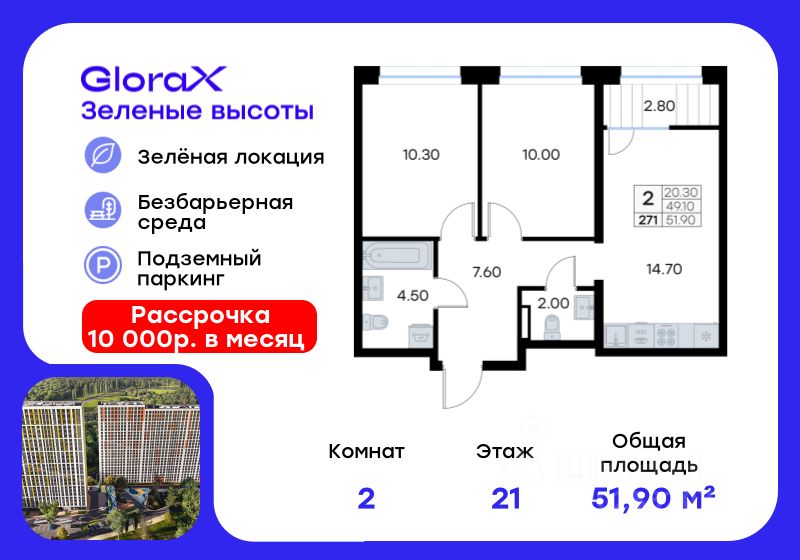 Продается 2-комн. квартира на 21-м этаже в жилом квартале GloraX Зелёные высоты — проекте в тихой зелёной локации. Общая площадь квартиры 51,90 кв. м, из которых 20,30 кв. м включая 20,30 кв. м жилого пространства и 14,70 кв. м кухни. Номер квартиры - 271. Преимущества квартиры: компактная евро-3, лоджия. Преимущества проекта: • Идеальное сочетание городской и загородной жизни • Сдаем в 2025 году • Уютный зелёный район с развитой инфраструктурой • Великолепные виды на Вечнозеленый сквер и лесопарк на 150 Га • Видеонаблюдение, IP-домофон, Wi-Fi на территории, • Дизайнерские входные группы • Безбарьерная среда, колясочные, туалеты на 1 этаже, лапомойки • Эксклюзивное благоустройство территории • Подземный паркинг на 235 машино-мест с лифтом на жилые этажи • Индивидуальные кладовые от 3 до 7 кв. м • Черновая отделка для реализации любых дизайнерских идей GloraX Зелёные высоты — современный жилой проект, сочетающий преимущества городской и пригородной жизни. Комплекс тщательно продуман для максимального удобства и обеспечения безопасности жителей. Квартал расположен в зеленом, живописном и активно развивающемся районе Зеленый Угол, вдали от серой массовой застройки. Жители GloraX Зелёные высоты смогут насладждаться прогулками в Вечнозелёном сквере или лесопарке. В непосредственной близости находятся остановки общественного транспорта и автомобильный подъезд со стороны Нейбута. Скоро также появится выездом на трассу Де-Фриз-Седанка, что обеспечит быстрый доступ в любую часть города и пригород. Проект включает 2 корпуса, каждый из которых спроектирован с акцентом на комфорт, безопасность и современный образ жизни. В комплексе предусмотрен подземный паркинг на 235 машиномест с доступом прямо с жилых этажей. Паркинг оборудован современными системами видеонаблюдения, контроля въезда-выезда и пожаротушения. Цокольный этаж здания отведен под индивидуальные кладовые площадью от 3 до 7 квадратных метров, которые можно использовать для хранения сезонных вещей. Доступ к кладовым - на лифте с жилых этажей. Территория жилого квартала благоустроена и включает игровые зоны и спортивные площадки для детей различных возрастных групп, уютные зоны отдыха со скамейками и универсальную воркаут-площадку для активного досуга. В шаговой доступности располагаются все необходимые объекты социальной инфраструктуры. Узнайте больше в отделе продаж — выберите свою квартиру в GloraX Зелёные высоты уже сегодня!