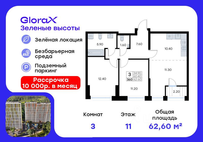 Продается 3-комн. квартира на 11-м этаже в жилом квартале GloraX Зелёные высоты — проекте в тихой зелёной локации. Общая площадь квартиры 62,60 кв. м, из которых 34,90 кв. м включая 34,90 кв. м жилого пространства и 10,40 кв. м кухни. Номер квартиры - 360. Преимущества квартиры: просторная 2 к.кв., лоджия. Преимущества проекта: • Идеальное сочетание городской и загородной жизни • Сдаем в 2025 году • Уютный зелёный район с развитой инфраструктурой • Великолепные виды на Вечнозеленый сквер и лесопарк на 150 Га • Видеонаблюдение, IP-домофон, Wi-Fi на территории, • Дизайнерские входные группы • Безбарьерная среда, колясочные, туалеты на 1 этаже, лапомойки • Эксклюзивное благоустройство территории • Подземный паркинг на 235 машино-мест с лифтом на жилые этажи • Индивидуальные кладовые от 3 до 7 кв. м • Черновая отделка для реализации любых дизайнерских идей GloraX Зелёные высоты — современный жилой проект, сочетающий преимущества городской и пригородной жизни. Комплекс тщательно продуман для максимального удобства и обеспечения безопасности жителей. Квартал расположен в зеленом, живописном и активно развивающемся районе Зеленый Угол, вдали от серой массовой застройки. Жители GloraX Зелёные высоты смогут насладждаться прогулками в Вечнозелёном сквере или лесопарке. В непосредственной близости находятся остановки общественного транспорта и автомобильный подъезд со стороны Нейбута. Скоро также появится выездом на трассу Де-Фриз-Седанка, что обеспечит быстрый доступ в любую часть города и пригород. Проект включает 2 корпуса, каждый из которых спроектирован с акцентом на комфорт, безопасность и современный образ жизни. В комплексе предусмотрен подземный паркинг на 235 машиномест с доступом прямо с жилых этажей. Паркинг оборудован современными системами видеонаблюдения, контроля въезда-выезда и пожаротушения. Цокольный этаж здания отведен под индивидуальные кладовые площадью от 3 до 7 квадратных метров, которые можно использовать для хранения сезонных вещей. Доступ к кладовым - на лифте с жилых этажей. Территория жилого квартала благоустроена и включает игровые зоны и спортивные площадки для детей различных возрастных групп, уютные зоны отдыха со скамейками и универсальную воркаут-площадку для активного досуга. В шаговой доступности располагаются все необходимые объекты социальной инфраструктуры. Узнайте больше в отделе продаж — выберите свою квартиру в GloraX Зелёные высоты уже сегодня!