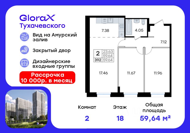 Продается 2-комн. квартира на 18-м этаже в жилом комплексе GloraX Тухачевского — современном проекте нового формата в престижном районе Владивостока. Общая площадь лота составляет 59,64 кв. м, из которых 23,63 кв. м отведено под жилую и 7,38 кв. м под кухонную зону. Номер квартиры - 392. Преимущества квартиры: двухкомнатная квартира, высокий этаж. Преимущества проекта: • Панорамный вид на Амурский залив и зелёные сопки • Удачное расположение и транспортная доступность: Первореченский район, 20 минут до центра города • Закрытая охраняемая территория с доступом только для жителей • Эксклюзивное благоустройство: продуманное зонирование, игровые и спортивные площадки, арт-инсталляция, Тайный сад • Безбарьерная среда, видеонаблюдений, Wi-Fi на территории • Премиальный дизайн входных групп реcепшн и лаунж-зоной • Лапомойки, колясочные и туалеты на первом этаже • Подземный паркинг на 449 машиномест с доступом на лифте с жилых этажей • Индивидуальные кладовые на цокольном этаже от 2 до 10 м2 GloraX Тухачевского — это городское пространство нового формата, которое позволяет современным горожанам находить все необходимые атрибуты комфортной жизни внутри своего жилого комплекса. Весь комплекс спроектирован так, чтобы жить здесь было удобно и безопасно: светлые лаунж-зоны и ресепшн на входах в жилые корпуса, эксклюзивный дизайн мест общего пользования и придомовой территории, круглосуточная охрана, видеонаблюдение и даже детский сад в одном из корпусов все, что необходимо современному городскому жителю. GloraX Тухачевского находится в одном из самых престижных районов города с хорошей, давно сформировавшейся инфраструктурой и отличной транспортной доступностью. Отсюда легко добраться до центра города, других районов и даже пригорода как на собственном транспорте, так и на общественном. Квартал имеет прямой выезд на ул. Тухачевского, а рядом с комплексом расположена автобусная остановка на несколько маршрутов. Проект состоит из 3 монолитных корпусов, объединенных единым стилобатом. В комплексе предусмотрены: подземный паркинг с лифтом на жилые этажи, кладовые для хранения, благоустроенный двор без машин, детские и спортивные площадки, зоны для отдыха и прогулок. Эксклюзивный проект благоустройства территории разработан одной из лучших студий ландшафтного дизайна DEREVOPARK с фокусом на комфорт и удобство для всех жителей комплекса. Вся необходимая инфраструктура — магазины, школы, детские сады, остановки общественного транспорта — находится рядом. Узнайте подробности и подберите свою квартиру в GloraX Тухачевского — в отделе продаж уже сегодня. Цена указана при 100% оплате или стандартной ипотеке. Узнайте подробности в Отделе продаж.