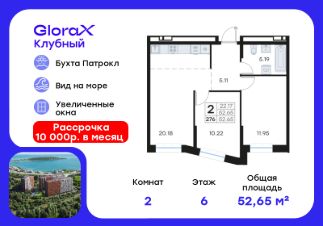 Продается 2-комн. квартира на 6-м этаже в квартале GloraX Клубный. GloraX Клубный - уникальный видовой проект с выделяющейся архитектурой в развитом районе Владивостока. Общая площадь лота составляет 52,65 кв. м, из которых 22,17 кв. м отведено под жилую и 20,18 кв. м под кухонную зону. Номер квартиры - 276.Преимущества квартиры:евро-трехкомнатная квартира.Преимущества проекта:• Квартиры с панорамными видами на бухту Патрокл, маяк Басаргина и остров Русский• Планировочные решения под любой жизненный сценарий от 23 до 67 м²• Гардеробные комнаты, увеличенные панорамные окна, просторные кухни-гостиные• Эксклюзивное благоустройство: продуманное зонирование, игровые и спортивные площадки, площадка для стритбола, амфитеатр• Премиальный дизайн входных групп с лаунж-зоной• Безбарьерная среда, закрытая территория, видеонаблюдение• Лапомойки, колясочные и туалеты на первом этаже• Двухуровневый подземный паркинг на 350 машино-мест с лифтом на жилые этажи• Келлеры на цокольном этаже для хранения сезонных вещей с доступом на лифте• Современный ландшафтный дизайн комплекса от DEREVOPARKGloraX Клубный заповедник в черте мегаполиса. Комплекс тщательно продуман для максимального удобства и обеспечения безопасности его жителей. Квартал расположен в одном из самых современных развивающихся районов города: совсем рядом раскинулась живописная бухта Патрокл, где можно прогуляться по облагороженной пешеходной набережной, заглянуть на пляж или в школу серфинга. Комплекс имеет прекрасную транспортную доступность: рядом проходит объездная трасса СеданкаПатрокл, а до центар можно доехать всего за 15 минут.Проект включает 3 монолитных корпуса, каждый из которых спроектирован с акцентом на комфорт, безопасность и современный образ жизни рядом с уникальной природой. Общий двор создает приватную территорию для житей комплекса.В комплексе предусмотрен двухуровневый подземный паркинг на 350 машино-мест с доступом прямо с жилых этажей. Паркинг оборудован современными системами видеонаблюдения, контроля въезда-выезда и пожаротушения. На цокольном этаже размещаются келлеры для хранения сезонных и габаритных вещей. Доступ к кладовым на лифте с жилых этажей. Современный ландшафтный дизайн жилого комплекса GloraX Клубный создан ведущей российской студией DEREVOPARK. Во дворе для детей всех возрастов предусмотрены различные игровые площадки с лазалками, батутами, качелями и песочницей. В центре расположен специальный ''зеленый остров'', где взрослые могут отдохнуть на качелях и гамаках в тени больших деревьев. Для любителей спорта предусмотрены две специальные спортивные площадки для настольного тенниса и стритбола — для зрителей тоже найдется место! А еще на территории комплекса будет дорожка для роллеров и любителей покататься на велосипеде, самокате или скейте.В шаговой доступности располагаются все необходимые объекты социальной и коммерческой инфраструктуры.Цена указана при 100% оплате