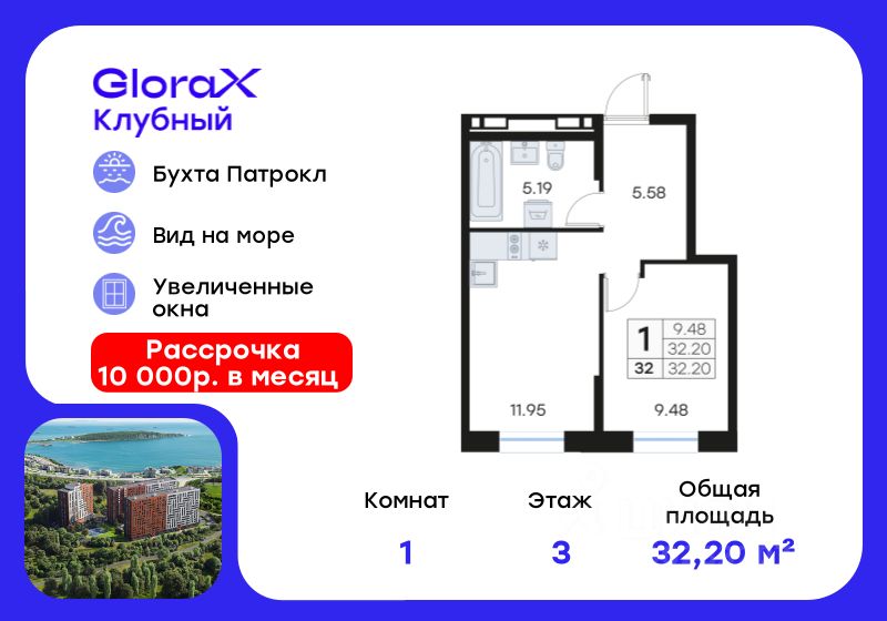 Продается 1-комн. квартира на 3-м этаже в квартале GloraX Клубный. GloraX Клубный - уникальный видовой проект с выделяющейся архитектурой в развитом районе Владивостока. Общая площадь лота составляет 32,20 кв. м, из которых 9,48 кв. м отведено под жилую и 11,95 кв. м под кухонную зону. Номер квартиры - 32. Преимущества квартиры: однокомнатная квартира, вид на море. Преимущества проекта: • Квартиры с панорамными видами на бухту Патрокл, маяк Басаргина и остров Русский • Планировочные решения под любой жизненный сценарий от 23 до 67 м² • Гардеробные комнаты, увеличенные панорамные окна, просторные кухни-гостиные • Эксклюзивное благоустройство: продуманное зонирование, игровые и спортивные площадки, площадка для стритбола, амфитеатр • Премиальный дизайн входных групп с лаунж-зоной • Безбарьерная среда, закрытая территория, видеонаблюдение • Лапомойки, колясочные и туалеты на первом этаже • Двухуровневый подземный паркинг на 350 машино-мест с лифтом на жилые этажи • Келлеры на цокольном этаже для хранения сезонных вещей с доступом на лифте • Современный ландшафтный дизайн комплекса от DEREVOPARK GloraX Клубный заповедник в черте мегаполиса. Комплекс тщательно продуман для максимального удобства и обеспечения безопасности его жителей. Квартал расположен в одном из самых современных развивающихся районов города: совсем рядом раскинулась живописная бухта Патрокл, где можно прогуляться по облагороженной пешеходной набережной, заглянуть на пляж или в школу серфинга. Комплекс имеет прекрасную транспортную доступность: рядом проходит объездная трасса СеданкаПатрокл, а до центар можно доехать всего за 15 минут. Проект включает 3 монолитных корпуса, каждый из которых спроектирован с акцентом на комфорт, безопасность и современный образ жизни рядом с уникальной природой. Общий двор создает приватную территорию для житей комплекса. В комплексе предусмотрен двухуровневый подземный паркинг на 350 машино-мест с доступом прямо с жилых этажей. Паркинг оборудован современными системами видеонаблюдения, контроля въезда-выезда и пожаротушения. На цокольном этаже размещаются келлеры для хранения сезонных и габаритных вещей. Доступ к кладовым на лифте с жилых этажей. Современный ландшафтный дизайн жилого комплекса GloraX Клубный создан ведущей российской студией DEREVOPARK. Во дворе для детей всех возрастов предусмотрены различные игровые площадки с лазалками, батутами, качелями и песочницей. В центре расположен специальный ''зеленый остров'', где взрослые могут отдохнуть на качелях и гамаках в тени больших деревьев. Для любителей спорта предусмотрены две специальные спортивные площадки для настольного тенниса и стритбола — для зрителей тоже найдется место! А еще на территории комплекса будет дорожка для роллеров и любителей покататься на велосипеде, самокате или скейте. В шаговой доступности располагаются все необходимые объекты социальной и коммерческой инфраструктуры. Цена указана при 100% о