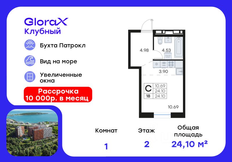 Продается квартира-студия на 2-м этаже в квартале GloraX Клубный. GloraX Клубный - уникальный видовой проект с выделяющейся архитектурой в развитом районе Владивостока. Общая площадь лота составляет 24,10 кв. м, из которых 10,69 кв. м отведено под жилую и 3,90 кв. м под кухонную зону. Номер квартиры - 18. Преимущества квартиры: студия, вид на море. Преимущества проекта: • Квартиры с панорамными видами на бухту Патрокл, маяк Басаргина и остров Русский • Планировочные решения под любой жизненный сценарий от 23 до 67 м² • Гардеробные комнаты, увеличенные панорамные окна, просторные кухни-гостиные • Эксклюзивное благоустройство: продуманное зонирование, игровые и спортивные площадки, площадка для стритбола, амфитеатр • Премиальный дизайн входных групп с лаунж-зоной • Безбарьерная среда, закрытая территория, видеонаблюдение • Лапомойки, колясочные и туалеты на первом этаже • Двухуровневый подземный паркинг на 350 машино-мест с лифтом на жилые этажи • Келлеры на цокольном этаже для хранения сезонных вещей с доступом на лифте • Современный ландшафтный дизайн комплекса от DEREVOPARK GloraX Клубный заповедник в черте мегаполиса. Комплекс тщательно продуман для максимального удобства и обеспечения безопасности его жителей. Квартал расположен в одном из самых современных развивающихся районов города: совсем рядом раскинулась живописная бухта Патрокл, где можно прогуляться по облагороженной пешеходной набережной, заглянуть на пляж или в школу серфинга. Комплекс имеет прекрасную транспортную доступность: рядом проходит объездная трасса СеданкаПатрокл, а до центар можно доехать всего за 15 минут. Проект включает 3 монолитных корпуса, каждый из которых спроектирован с акцентом на комфорт, безопасность и современный образ жизни рядом с уникальной природой. Общий двор создает приватную территорию для житей комплекса. В комплексе предусмотрен двухуровневый подземный паркинг на 350 машино-мест с доступом прямо с жилых этажей. Паркинг оборудован современными системами видеонаблюдения, контроля въезда-выезда и пожаротушения. На цокольном этаже размещаются келлеры для хранения сезонных и габаритных вещей. Доступ к кладовым на лифте с жилых этажей. Современный ландшафтный дизайн жилого комплекса GloraX Клубный создан ведущей российской студией DEREVOPARK. Во дворе для детей всех возрастов предусмотрены различные игровые площадки с лазалками, батутами, качелями и песочницей. В центре расположен специальный ''зеленый остров'', где взрослые могут отдохнуть на качелях и гамаках в тени больших деревьев. Для любителей спорта предусмотрены две специальные спортивные площадки для настольного тенниса и стритбола — для зрителей тоже найдется место! А еще на территории комплекса будет дорожка для роллеров и любителей покататься на велосипеде, самокате или скейте. В шаговой доступности располагаются все необходимые объекты социальной и коммерческой инфраструктуры. Цена указана при 100% оплате или стандарт