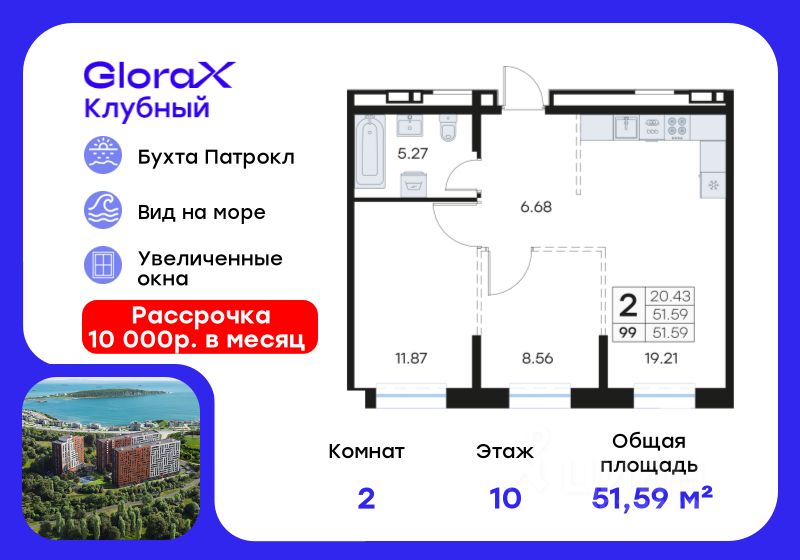 Продается 2-комн. квартира на 10-м этаже в квартале GloraX Клубный. GloraX Клубный - уникальный видовой проект с выделяющейся архитектурой в развитом районе Владивостока. Общая площадь лота составляет 51,59 кв. м, из которых 20,43 кв. м отведено под жилую и 19,21 кв. м под кухонную зону. Номер квартиры - 99. Преимущества квартиры: евро-трехкомнатная квартира, вид на море. Преимущества проекта: • Квартиры с панорамными видами на бухту Патрокл, маяк Басаргина и остров Русский • Планировочные решения под любой жизненный сценарий от 23 до 67 м² • Гардеробные комнаты, увеличенные панорамные окна, просторные кухни-гостиные • Эксклюзивное благоустройство: продуманное зонирование, игровые и спортивные площадки, площадка для стритбола, амфитеатр • Премиальный дизайн входных групп с лаунж-зоной • Безбарьерная среда, закрытая территория, видеонаблюдение • Лапомойки, колясочные и туалеты на первом этаже • Двухуровневый подземный паркинг на 350 машино-мест с лифтом на жилые этажи • Келлеры на цокольном этаже для хранения сезонных вещей с доступом на лифте • Современный ландшафтный дизайн комплекса от DEREVOPARK GloraX Клубный заповедник в черте мегаполиса. Комплекс тщательно продуман для максимального удобства и обеспечения безопасности его жителей. Квартал расположен в одном из самых современных развивающихся районов города: совсем рядом раскинулась живописная бухта Патрокл, где можно прогуляться по облагороженной пешеходной набережной, заглянуть на пляж или в школу серфинга. Комплекс имеет прекрасную транспортную доступность: рядом проходит объездная трасса СеданкаПатрокл, а до центар можно доехать всего за 15 минут. Проект включает 3 монолитных корпуса, каждый из которых спроектирован с акцентом на комфорт, безопасность и современный образ жизни рядом с уникальной природой. Общий двор создает приватную территорию для житей комплекса. В комплексе предусмотрен двухуровневый подземный паркинг на 350 машино-мест с доступом прямо с жилых этажей. Паркинг оборудован современными системами видеонаблюдения, контроля въезда-выезда и пожаротушения. На цокольном этаже размещаются келлеры для хранения сезонных и габаритных вещей. Доступ к кладовым на лифте с жилых этажей. Современный ландшафтный дизайн жилого комплекса GloraX Клубный создан ведущей российской студией DEREVOPARK. Во дворе для детей всех возрастов предусмотрены различные игровые площадки с лазалками, батутами, качелями и песочницей. В центре расположен специальный ''зеленый остров'', где взрослые могут отдохнуть на качелях и гамаках в тени больших деревьев. Для любителей спорта предусмотрены две специальные спортивные площадки для настольного тенниса и стритбола — для зрителей тоже найдется место! А еще на территории комплекса будет дорожка для роллеров и любителей покататься на велосипеде, самокате или скейте. В шаговой доступности располагаются все необходимые объекты социальной и коммерческой инфраструктуры. Цена указана при