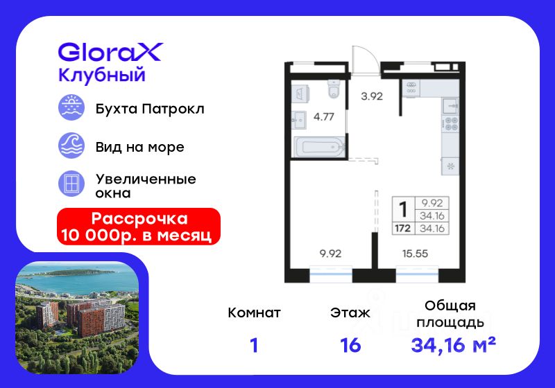 Продается 1-комн. квартира на 16-м этаже в квартале GloraX Клубный. GloraX Клубный - уникальный видовой проект с выделяющейся архитектурой в развитом районе Владивостока. Общая площадь лота составляет 34,16 кв. м, из которых 9,92 кв. м отведено под жилую и 15,55 кв. м под кухонную зону. Номер квартиры - 172. Преимущества квартиры: евро-двухкомнатная квартира, вид на море, высокий этаж. Преимущества проекта: • Квартиры с панорамными видами на бухту Патрокл, маяк Басаргина и остров Русский • Планировочные решения под любой жизненный сценарий от 23 до 67 м² • Гардеробные комнаты, увеличенные панорамные окна, просторные кухни-гостиные • Эксклюзивное благоустройство: продуманное зонирование, игровые и спортивные площадки, площадка для стритбола, амфитеатр • Премиальный дизайн входных групп с лаунж-зоной • Безбарьерная среда, закрытая территория, видеонаблюдение • Лапомойки, колясочные и туалеты на первом этаже • Двухуровневый подземный паркинг на 350 машино-мест с лифтом на жилые этажи • Келлеры на цокольном этаже для хранения сезонных вещей с доступом на лифте • Современный ландшафтный дизайн комплекса от DEREVOPARK GloraX Клубный заповедник в черте мегаполиса. Комплекс тщательно продуман для максимального удобства и обеспечения безопасности его жителей. Квартал расположен в одном из самых современных развивающихся районов города: совсем рядом раскинулась живописная бухта Патрокл, где можно прогуляться по облагороженной пешеходной набережной, заглянуть на пляж или в школу серфинга. Комплекс имеет прекрасную транспортную доступность: рядом проходит объездная трасса СеданкаПатрокл, а до центар можно доехать всего за 15 минут. Проект включает 3 монолитных корпуса, каждый из которых спроектирован с акцентом на комфорт, безопасность и современный образ жизни рядом с уникальной природой. Общий двор создает приватную территорию для житей комплекса. В комплексе предусмотрен двухуровневый подземный паркинг на 350 машино-мест с доступом прямо с жилых этажей. Паркинг оборудован современными системами видеонаблюдения, контроля въезда-выезда и пожаротушения. На цокольном этаже размещаются келлеры для хранения сезонных и габаритных вещей. Доступ к кладовым на лифте с жилых этажей. Современный ландшафтный дизайн жилого комплекса GloraX Клубный создан ведущей российской студией DEREVOPARK. Во дворе для детей всех возрастов предусмотрены различные игровые площадки с лазалками, батутами, качелями и песочницей. В центре расположен специальный ''зеленый остров'', где взрослые могут отдохнуть на качелях и гамаках в тени больших деревьев. Для любителей спорта предусмотрены две специальные спортивные площадки для настольного тенниса и стритбола — для зрителей тоже найдется место! А еще на территории комплекса будет дорожка для роллеров и любителей покататься на велосипеде, самокате или скейте. В шаговой доступности располагаются все необходимые объекты социальной и коммерческой инфраструктуры. Це