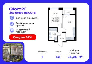 Продается 1-комн. квартира на 25-м этаже в жилом квартале GloraX Зелёные высоты — проекте в тихой зелёной локации. Общая площадь квартиры 35,20 кв. м, из которых 10,40 кв. м включая 10,40 кв. м жилого пространства и 13,40 кв. м кухни. Номер квартиры - 748.Преимущества квартиры:компактная евро-2, лоджия.Преимущества проекта:• Идеальное сочетание городской и загородной жизни• Сдаем в 2025 году• Уютный зелёный район с развитой инфраструктурой• Великолепные виды на Вечнозеленый сквер и лесопарк на 150 Га• Видеонаблюдение, IP-домофон, Wi-Fi на территории,• Дизайнерские входные группы• Безбарьерная среда, колясочные, туалеты на 1 этаже, лапомойки• Эксклюзивное благоустройство территории • Подземный паркинг на 235 машино-мест с лифтом на жилые этажи• Индивидуальные кладовые от 3 до 7 кв. м• Черновая отделка для реализации любых дизайнерских идейGloraX Зелёные высоты — современный жилой проект, сочетающий преимущества городской и пригородной жизни. Комплекс тщательно продуман для максимального удобства и обеспечения безопасности жителей. Квартал расположен в зеленом, живописном и активно развивающемся районе Зеленый Угол, вдали от серой массовой застройки. Жители GloraX Зелёные высоты смогут насладждаться прогулками в Вечнозелёном сквере или лесопарке. В непосредственной близости находятся остановки общественного транспорта и автомобильный подъезд со стороны Нейбута. Скоро также появится выездом на трассу Де-Фриз-Седанка, что обеспечит быстрый доступ в любую часть города и пригород.Проект включает 2 корпуса, каждый из которых спроектирован с акцентом на комфорт, безопасность и современный образ жизни.В комплексе предусмотрен подземный паркинг на 235 машиномест с доступом прямо с жилых этажей. Паркинг оборудован современными системами видеонаблюдения, контроля въезда-выезда и пожаротушения. Цокольный этаж здания отведен под индивидуальные кладовые площадью от 3 до 7 квадратных метров, которые можно использовать для хранения сезонных вещей. Доступ к кладовым - на лифте с жилых этажей.Территория жилого квартала благоустроена и включает игровые зоны и спортивные площадки для детей различных возрастных групп, уютные зоны отдыха со скамейками и универсальную воркаут-площадку для активного досуга.В шаговой доступности располагаются все необходимые объекты социальной инфраструктуры.Узнайте больше в отделе продаж — выберите свою квартиру в GloraX Зелёные высоты уже сегодня!