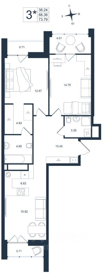 Продаётся 3-комнатная квартира в строящемся доме (Дом 1), срок сдачи: III-кв. 2027, общей площадью 73.74 кв.м., на 4 этаже. Новый жилой комплекс ''Архитектор'' от группы компаний ''Девелопмент-Юг'' расположен по адресу: г. Владивосток, по ул. Бежецкая.