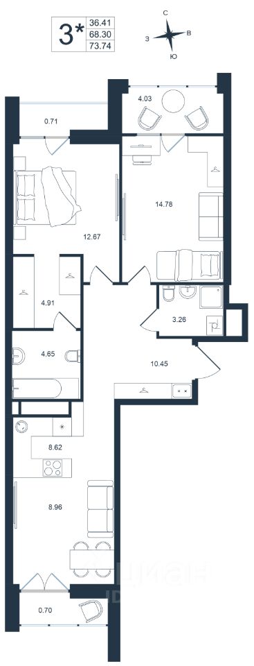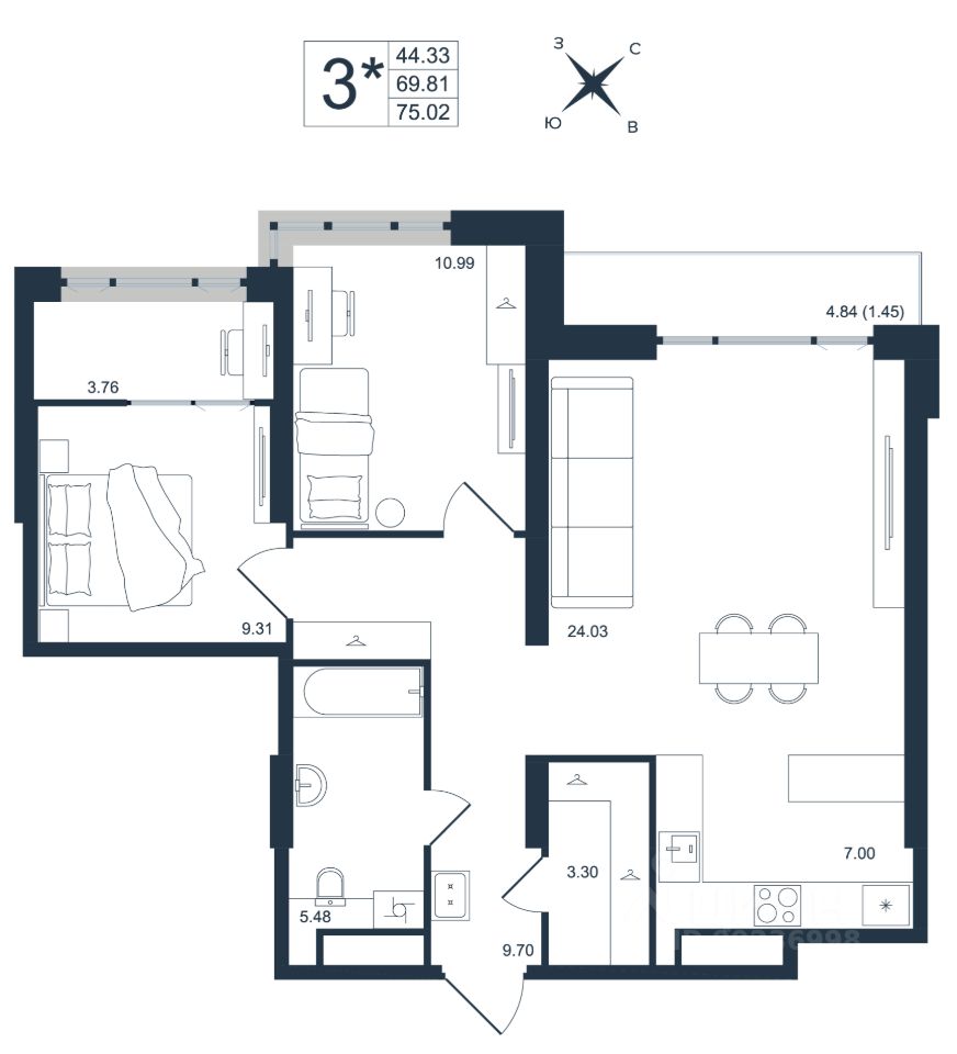 Идеальная квартира для молодой семьи Кухня-столовая 13,7 кв.м для семейных завтраков и ужинов Просторная родительская спальня 14,7 кв.м с выходом на лоджию, где можно наслаждаться свежим воздухом Уютная детская комната 11,3 кв.м для занятий учебой и отдыха Прихожая 4,8 кв.м с местом под шкаф-купе Ванная комната 4 кв.м в удобном расположении для всех членов семьи