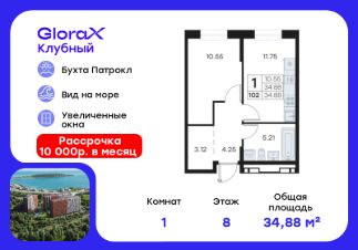 Продается 2-комн. квартира на 9-м этаже в квартале GloraX Клубный. GloraX Клубный - уникальный видовой проект с выделяющейся архитектурой в развитом районе Владивостока. Общая площадь лота составляет 41,26 кв. м, из которых 22,19 кв. м отведено под жилую и 9,44 кв. м под кухонную зону. Номер квартиры - 89.Преимущества квартиры:двухкомнатная квартира, вид на море, угловая.Преимущества проекта:• Квартиры с панорамными видами на бухту Патрокл, маяк Басаргина и остров Русский• Планировочные решения под любой жизненный сценарий от 23 до 67 м²• Гардеробные комнаты, увеличенные панорамные окна, просторные кухни-гостиные• Эксклюзивное благоустройство: продуманное зонирование, игровые и спортивные площадки, площадка для стритбола, амфитеатр• Премиальный дизайн входных групп с лаунж-зоной• Безбарьерная среда, закрытая территория, видеонаблюдение• Лапомойки, колясочные и туалеты на первом этаже• Двухуровневый подземный паркинг на 350 машино-мест с лифтом на жилые этажи• Келлеры на цокольном этаже для хранения сезонных вещей с доступом на лифте• Современный ландшафтный дизайн комплекса от DEREVOPARKGloraX Клубный заповедник в черте мегаполиса. Комплекс тщательно продуман для максимального удобства и обеспечения безопасности его жителей. Квартал расположен в одном из самых современных развивающихся районов города: совсем рядом раскинулась живописная бухта Патрокл, где можно прогуляться по облагороженной пешеходной набережной, заглянуть на пляж или в школу серфинга. Комплекс имеет прекрасную транспортную доступность: рядом проходит объездная трасса СеданкаПатрокл, а до центар можно доехать всего за 15 минут.Проект включает 3 монолитных корпуса, каждый из которых спроектирован с акцентом на комфорт, безопасность и современный образ жизни рядом с уникальной природой. Общий двор создает приватную территорию для житей комплекса.В комплексе предусмотрен двухуровневый подземный паркинг на 350 машино-мест с доступом прямо с жилых этажей. Паркинг оборудован современными системами видеонаблюдения, контроля въезда-выезда и пожаротушения. На цокольном этаже размещаются келлеры для хранения сезонных и габаритных вещей. Доступ к кладовым на лифте с жилых этажей. Современный ландшафтный дизайн жилого комплекса GloraX Клубный создан ведущей российской студией DEREVOPARK. Во дворе для детей всех возрастов предусмотрены различные игровые площадки с лазалками, батутами, качелями и песочницей. В центре расположен специальный ''зеленый остров'', где взрослые могут отдохнуть на качелях и гамаках в тени больших деревьев. Для любителей спорта предусмотрены две специальные спортивные площадки для настольного тенниса и стритбола — для зрителей тоже найдется место! А еще на территории комплекса будет дорожка для роллеров и любителей покататься на велосипеде, самокате или скейте.В шаговой доступности располагаются все необходимые объекты социальной и коммерческой инфраструктуры.Цена указана п