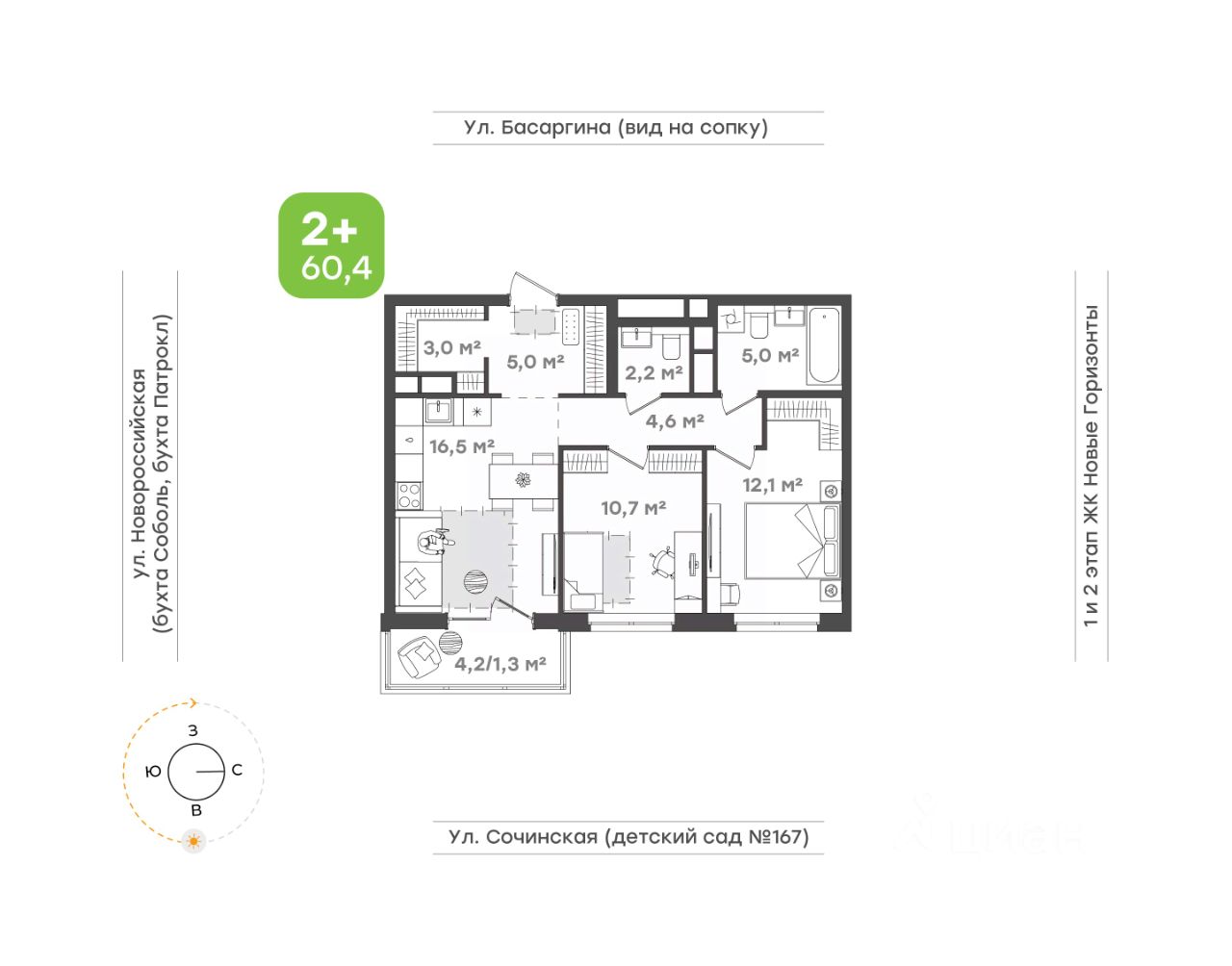 Вид на морские бухты и закаты Коридор 5,4 кв.м. с местом под шкаф-купе для утренних прощаний и радостных вечерних встреч Кухня-гостиная 17,8 кв.м. для самых смелых кулинарных экспериментов Раздельные санузел 3,7 кв.м. и ванная 4 кв.м. для удобства большой семьи Одна детская 10,3 кв.м. с видом на лесной массив с пространством для учебы и игр Вторая детская 10,4 кв.м. с выходом на балкон и видом на морские пейзажи Спальня 11,5 кв.м. для тихого уединения и наслаждения видами на природу, море и закаты