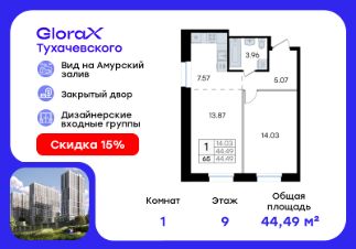 Продается 1-комн. квартира на 9-м этаже в жилом комплексе GloraX Тухачевского — современном проекте нового формата в престижном районе Владивостока. Общая площадь лота составляет 44,49 кв. м, из которых 14,03 кв. м отведено под жилую и 7,57 кв. м под кухонную зону. Номер квартиры - 65.Преимущества квартиры:однокомнатная квартира, угловая.Преимущества проекта:• Панорамный вид на Амурский залив и зелёные сопки• Удачное расположение и транспортная доступность: Первореченский район, 20 минут до центра города• Закрытая охраняемая территория с доступом только для жителей• Эксклюзивное благоустройство: продуманное зонирование, игровые и спортивные площадки, арт-инсталляция, Тайный сад• Безбарьерная среда, видеонаблюдений, Wi-Fi на территории• Премиальный дизайн входных групп реcепшн и лаунж-зоной• Лапомойки, колясочные и туалеты на первом этаже• Подземный паркинг на 449 машиномест с доступом на лифте с жилых этажей• Индивидуальные кладовые на цокольном этаже от 2 до 10 м2GloraX Тухачевского — это городское пространство нового формата, которое позволяет современным горожанам находить все необходимые атрибуты комфортной жизни внутри своего жилого комплекса. Весь комплекс спроектирован так, чтобы жить здесь было удобно и безопасно: светлые лаунж-зоны и ресепшн на входах в жилые корпуса, эксклюзивный дизайн мест общего пользования и придомовой территории, круглосуточная охрана, видеонаблюдение и даже детский сад в одном из корпусов все, что необходимо современному городскому жителю. GloraX Тухачевского находится в одном из самых престижных районов города с хорошей, давно сформировавшейся инфраструктурой и отличной транспортной доступностью. Отсюда легко добраться до центра города, других районов и даже пригорода как на собственном транспорте, так и на общественном. Квартал имеет прямой выезд на ул. Тухачевского, а рядом с комплексом расположена автобусная остановка на несколько маршрутов.Проект состоит из 3 монолитных корпусов, объединенных единым стилобатом. В комплексе предусмотрены: подземный паркинг с лифтом на жилые этажи, кладовые для хранения, благоустроенный двор без машин, детские и спортивные площадки, зоны для отдыха и прогулок.Эксклюзивный проект благоустройства территории разработан одной из лучших студий ландшафтного дизайна DEREVOPARK с фокусом на комфорт и удобство для всех жителей комплекса.Вся необходимая инфраструктура — магазины, школы, детские сады, остановки общественного транспорта — находится рядом.Узнайте подробности и подберите свою квартиру в GloraX Тухачевского — в отделе продаж уже сегодня.Цена указана при 100% оплате или стандартной ипотеке. Узнайте подробности в Отделе продаж.