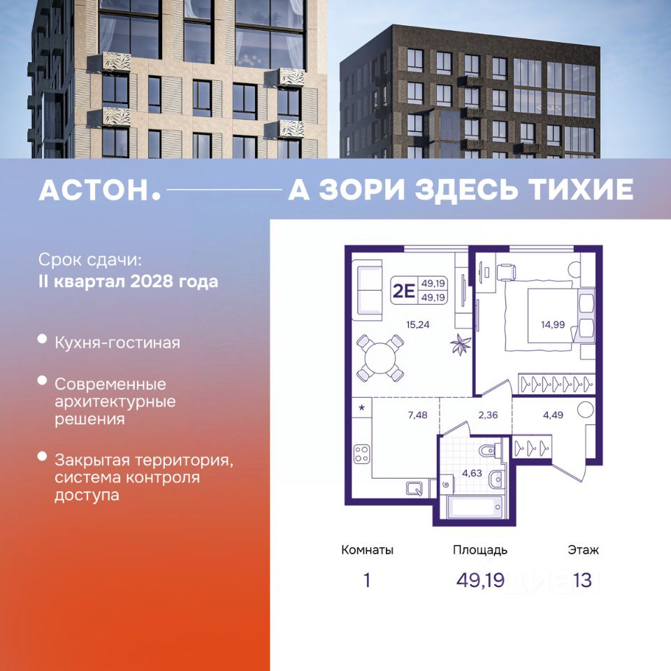 Спешите забронировать по этой цене, период акции ограничен! Стоимость квартиры указана со скидкой, ваша экономия составит 281,000 руб. Звоните, наши менеджеры вам все расскажут. Продается 1-комн. квартира в ЖК ''Астон. А зори здесь тихие'' на 13 этаже. Квартира без отделки, полностью готова к чистовой отделке и дальнейшему ремонту. Общая площадь: 49.19 кв.м., жилая: 14.99 кв.м., площадь просторной кухни-столовой: 22.72 кв.м. Все окна выходят на одну сторону. В квартире один совмещенный санузел. Высота потолков 2.87 м. Мы позаботились о том, чтобы сберечь ваше время и силы на все основные грязные, шумные ремонтные работы. В квартире предусмотрена черновая отделка: возведены стены, выполнена стяжка пола и нанесена улучшенная гипсовая штукатурка. Поверхности дополнительно прошпаклёваны базовым слоем. Просторная евро-двухкомнатная квартира с функциональным зонированием, большим количеством окон и света! Прекрасный выбор для одного или пары, особенно, если вы любите принимать гостей. Предусмотрена кухня-гостиная, в которой можно легко спланировать зону приготовления пищи и зону отдыха с диваном. Отдельная спальня с двумя окнами, где удобно расположится большая кровать. Просторный санузел с ванной и местом под стиральную машину. Дом монолитный, трехподъездный, высотой 17 этажей. Квартира находится во 2-й секции в корпусе 1. На этаже 5 квартир. В подъезде 1 пассажирский и 1 грузовой лифт. Окончание строительства - 2 квартал 2028 года. Оформление сделки по договору долевого участия. ''Астон. А зори здесь тихие'' — жилой дом бизнес-класса, состоящий из трёх 17-этажных секций, объединенных общим стилобатом. В каждой секции по 2 лифта, количество квартир на этаже — до 5. Для жителей предусмотрены подземный трехуровневый паркинг, кладовые помещения и колясочные, коммерческая инфраструктура на первом этаже. Территория жилого комплекса продумана так, чтобы ее жителям было безопасно и комфортно: — закрытый двор без машин, система контроля доступа, — детские площадки с учетом разных возрастных групп, — воркаут-зона, — безбарьерная среда, — велопарковки, Расположение: Жилой комплекс расположен на Патрокле — одном из самых быстроразвивающихся районов города. В пешей доступности — школа и детские сады, четыре пляжа, парк у озера и набережная для прогулок, торговый центр. В 10 минутах езды на автомобиле — Русский остров и бухта Золотой Рог, в 1 минуте — объездная Седанка—Патрокл. Добраться в любую точку города быстро и легко! Способы покупки: — дальневосточная ипотека, — семейная ипотека, — IT-ипотека, — ипотека для участников СВО и их семей, — рассрочка, О застройщике: Строительство проекта ''Астон. А зори здесь тихие'' осуществляет федеральный застройщик Астон. Проекты Астон — это современные жилые кварталы с вниманием к деталям и продуманным благоустройством в 4 городах России: Екатеринбурге, Новосибирске, Тюмени и Владивостоке. #26d0d2