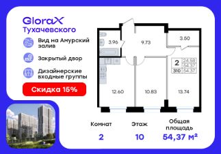 Продается 2-комн. квартира на 10-м этаже в жилом комплексе GloraX Тухачевского — современном проекте нового формата в престижном районе Владивостока. Общая площадь лота составляет 54,37 кв. м, из которых 24,58 кв. м отведено под жилую и 12,60 кв. м под кухонную зону. Номер квартиры - 310.Преимущества квартиры:двухкомнатная квартира, гардеробная.Преимущества проекта:• Панорамный вид на Амурский залив и зелёные сопки• Удачное расположение и транспортная доступность: Первореченский район, 20 минут до центра города• Закрытая охраняемая территория с доступом только для жителей• Эксклюзивное благоустройство: продуманное зонирование, игровые и спортивные площадки, арт-инсталляция, Тайный сад• Безбарьерная среда, видеонаблюдений, Wi-Fi на территории• Премиальный дизайн входных групп реcепшн и лаунж-зоной• Лапомойки, колясочные и туалеты на первом этаже• Подземный паркинг на 449 машиномест с доступом на лифте с жилых этажей• Индивидуальные кладовые на цокольном этаже от 2 до 10 м2GloraX Тухачевского — это городское пространство нового формата, которое позволяет современным горожанам находить все необходимые атрибуты комфортной жизни внутри своего жилого комплекса. Весь комплекс спроектирован так, чтобы жить здесь было удобно и безопасно: светлые лаунж-зоны и ресепшн на входах в жилые корпуса, эксклюзивный дизайн мест общего пользования и придомовой территории, круглосуточная охрана, видеонаблюдение и даже детский сад в одном из корпусов все, что необходимо современному городскому жителю. GloraX Тухачевского находится в одном из самых престижных районов города с хорошей, давно сформировавшейся инфраструктурой и отличной транспортной доступностью. Отсюда легко добраться до центра города, других районов и даже пригорода как на собственном транспорте, так и на общественном. Квартал имеет прямой выезд на ул. Тухачевского, а рядом с комплексом расположена автобусная остановка на несколько маршрутов.Проект состоит из 3 монолитных корпусов, объединенных единым стилобатом. В комплексе предусмотрены: подземный паркинг с лифтом на жилые этажи, кладовые для хранения, благоустроенный двор без машин, детские и спортивные площадки, зоны для отдыха и прогулок.Эксклюзивный проект благоустройства территории разработан одной из лучших студий ландшафтного дизайна DEREVOPARK с фокусом на комфорт и удобство для всех жителей комплекса.Вся необходимая инфраструктура — магазины, школы, детские сады, остановки общественного транспорта — находится рядом.Узнайте подробности и подберите свою квартиру в GloraX Тухачевского — в отделе продаж уже сегодня.Цена указана при 100% оплате или стандартной ипотеке. Узнайте подробности в Отделе продаж.