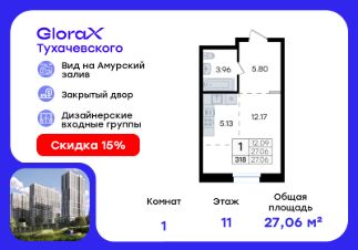 Продается квартира-студия на 11-м этаже в жилом комплексе GloraX Тухачевского — современном проекте нового формата в престижном районе Владивостока. Общая площадь лота составляет 27,06 кв. м, из которых 12,09 кв. м отведено под жилую и 5,13 кв. м под кухонную зону. Номер квартиры - 318.Преимущества квартиры:студия.Преимущества проекта:• Панорамный вид на Амурский залив и зелёные сопки• Удачное расположение и транспортная доступность: Первореченский район, 20 минут до центра города• Закрытая охраняемая территория с доступом только для жителей• Эксклюзивное благоустройство: продуманное зонирование, игровые и спортивные площадки, арт-инсталляция, Тайный сад• Безбарьерная среда, видеонаблюдений, Wi-Fi на территории• Премиальный дизайн входных групп реcепшн и лаунж-зоной• Лапомойки, колясочные и туалеты на первом этаже• Подземный паркинг на 449 машиномест с доступом на лифте с жилых этажей• Индивидуальные кладовые на цокольном этаже от 2 до 10 м2GloraX Тухачевского — это городское пространство нового формата, которое позволяет современным горожанам находить все необходимые атрибуты комфортной жизни внутри своего жилого комплекса. Весь комплекс спроектирован так, чтобы жить здесь было удобно и безопасно: светлые лаунж-зоны и ресепшн на входах в жилые корпуса, эксклюзивный дизайн мест общего пользования и придомовой территории, круглосуточная охрана, видеонаблюдение и даже детский сад в одном из корпусов все, что необходимо современному городскому жителю. GloraX Тухачевского находится в одном из самых престижных районов города с хорошей, давно сформировавшейся инфраструктурой и отличной транспортной доступностью. Отсюда легко добраться до центра города, других районов и даже пригорода как на собственном транспорте, так и на общественном. Квартал имеет прямой выезд на ул. Тухачевского, а рядом с комплексом расположена автобусная остановка на несколько маршрутов.Проект состоит из 3 монолитных корпусов, объединенных единым стилобатом. В комплексе предусмотрены: подземный паркинг с лифтом на жилые этажи, кладовые для хранения, благоустроенный двор без машин, детские и спортивные площадки, зоны для отдыха и прогулок.Эксклюзивный проект благоустройства территории разработан одной из лучших студий ландшафтного дизайна DEREVOPARK с фокусом на комфорт и удобство для всех жителей комплекса.Вся необходимая инфраструктура — магазины, школы, детские сады, остановки общественного транспорта — находится рядом.Узнайте подробности и подберите свою квартиру в GloraX Тухачевского — в отделе продаж уже сегодня.Цена указана при 100% оплате или стандартной ипотеке. Узнайте подробности в Отделе продаж.